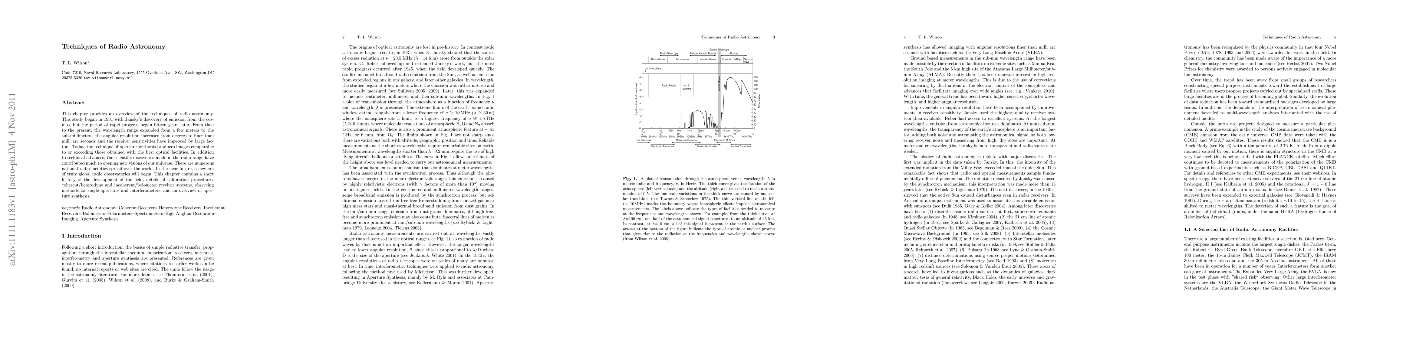 This chapter provides an overview of the techniques of radio astronomy. This study began in 1931 with Jansky's discovery of emission from the cosmos, but the period of rapid progress began fifteen years later. From then to the present, the wavelength range expanded from a few meters to the sub-millimeters, the angular resolution increased from degrees to finer than milli arc seconds and the receiver sensitivities have improved by large factors. Today, the technique of aperture synthesis produces images comparable to or exceeding those obtained with the best optical facilities. In addition to technical advances, the scientific discoveries made in the radio range have contributed much to opening new visions of our universe. There are numerous national radio facilities spread over the world. In the near future, a new era of truly global radio observatories will begin. This chapter contains a short history of the development of the field, details of calibration procedures, coherent/heterodyne and incoherent/bolometer receiver systems, observing methods for single apertures and interferometers, and an overview of aperture synthesis.