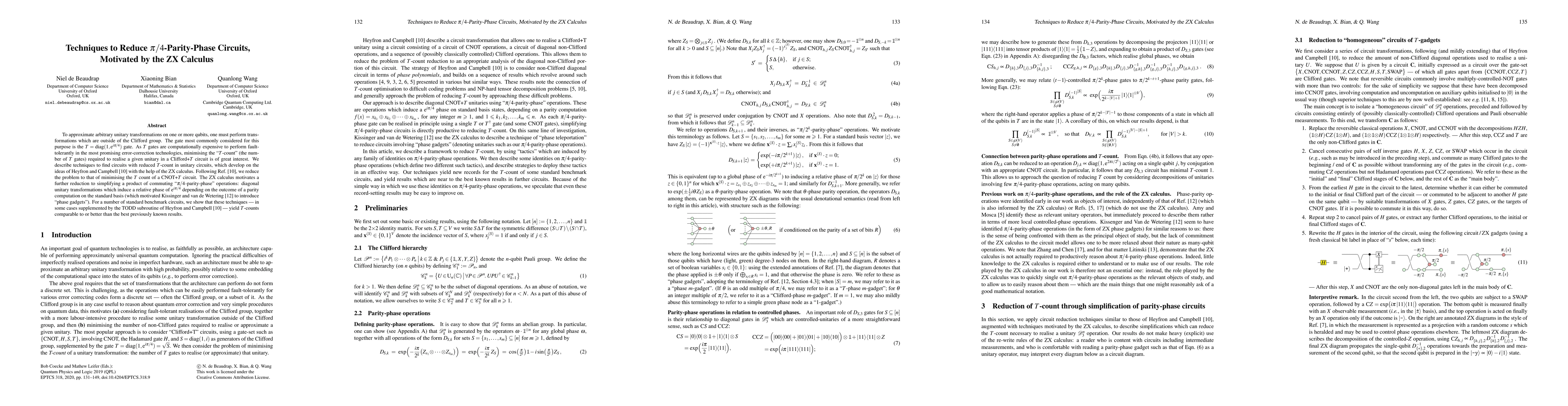 This paper presents techniques to minimize the number of T gates in Clifford+T circuits for approximating arbitrary unitary transformations on qubits, motivated by the ZX calculus. It develops methods to reduce the T-count by simplifying products of commuting π/4-parity-phase operations, achieving T-counts comparable to or better than previous results.