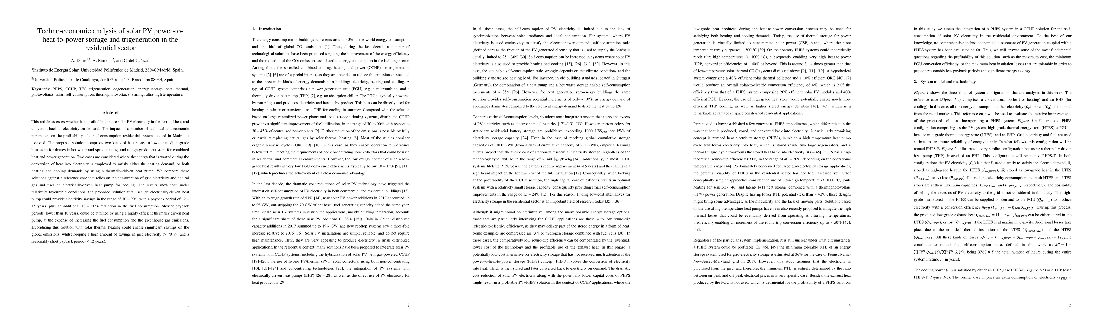 This article assesses whether it is profitable to store solar PV electricity in the form of heat and convert it back to electricity on demand. The impact of a number of technical and economic parameters on the profitability of a self-consumption residential system located in Madrid is assessed. The proposed solution comprises two kinds of heat stores: a low- or medium-grade heat store for domestic hot water and space heating, and a high-grade heat store for combined heat and power generation. Two cases are considered where the energy that is wasted during the conversion of heat into electricity is employed to satisfy either the heating demand, or both heating and cooling demands by using a thermally-driven heat pump. We compare these solutions against a reference case that relies on the consumption of grid electricity and natural gas and uses an electrically-driven heat pump for cooling. The results show that, under relatively favourable conditions, the proposed solution that uses an electrically-driven heat pump could provide electricity savings in the range of 70-90% with a payback period of 12-15 years, plus an additional 10-20% reduction in the fuel consumption. Shorter payback periods, lower than 10 years, could be attained by using a highly efficient thermally driven heat pump, at the expense of increasing the fuel consumption and the greenhouse gas emissions. Hybridising this solution with solar thermal heating could enable significant savings on the global emissions, whilst keeping a high amount of savings in grid electricity (> 70 %) and a reasonably short payback period (< 12 years).