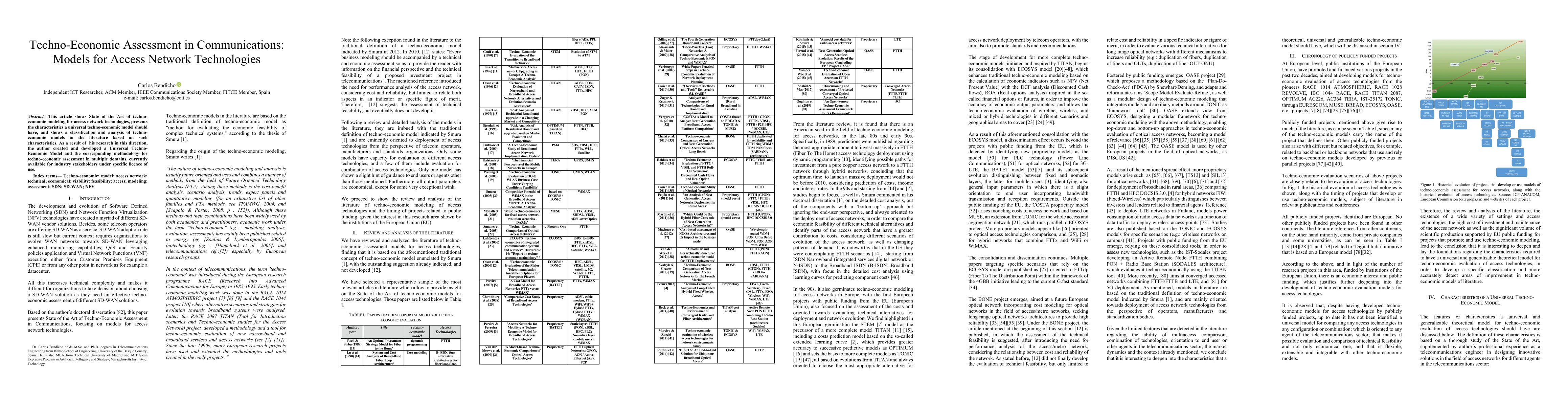 This article shows State of the Art of techno-economic modeling for access network technologies, presents the characteristics a universal techno-economic model should have, and shows a classification and analysis of techno-economic models in the literature based on such characteristics. As a result of his research in this direction, the author created and developed a Universal Techno-Economic Model and the corresponding methodology for techno-economic assessment in multiple domains, currently available for industry stakeholders under specific licence of use.