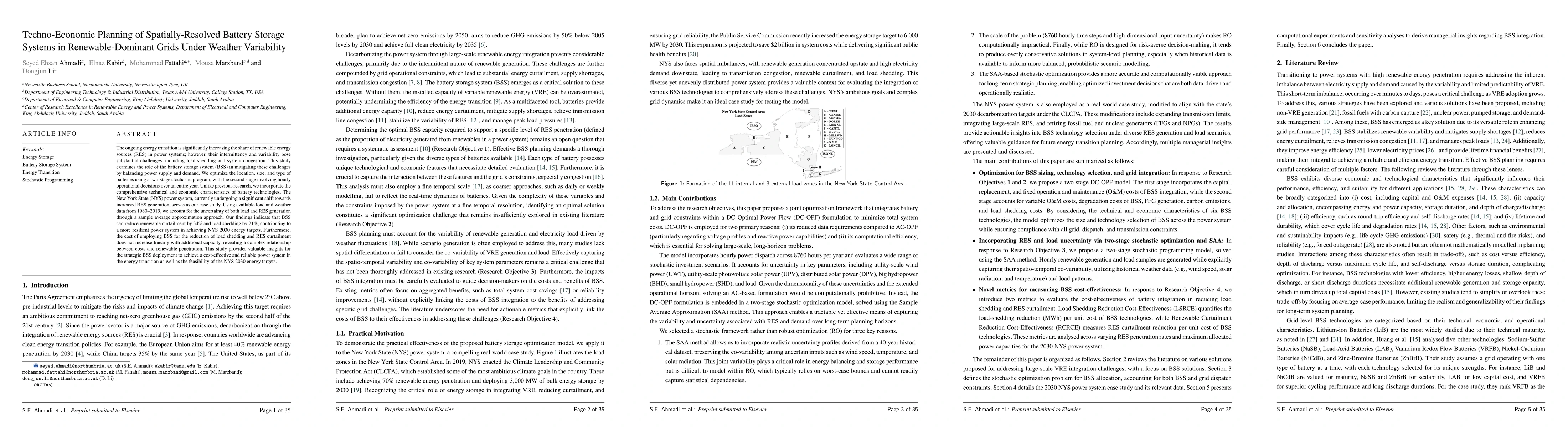 The ongoing energy transition is significantly increasing the share of renewable energy sources (RES) in power systems; however, their intermittency and variability pose substantial challenges, including load shedding and system congestion. This study examines the role of the battery storage system (BSS) in mitigating these challenges by balancing power supply and demand. We optimize the location, size, and type of batteries using a two-stage stochastic program, with the second stage involving hourly operational decisions over an entire year. Unlike previous research, we incorporate the comprehensive technical and economic characteristics of battery technologies. The New York State (NYS) power system, currently undergoing a significant shift towards increased RES generation, serves as our case study. Using available load and weather data from 1980-2019, we account for the uncertainty of both load and RES generation through a sample average approximation approach. Our findings indicate that BSS can reduce renewable curtailment by 34% and load shedding by 21%, contributing to a more resilient power system in achieving NYS 2030 energy targets. Furthermore, the cost of employing BSS for the reduction of load shedding and RES curtailment does not increase linearly with additional capacity, revealing a complex relationship between costs and renewable penetration. This study provides valuable insights for the strategic BSS deployment to achieve a cost-effective and reliable power system in the energy transition as well as the feasibility of the NYS 2030 energy targets.