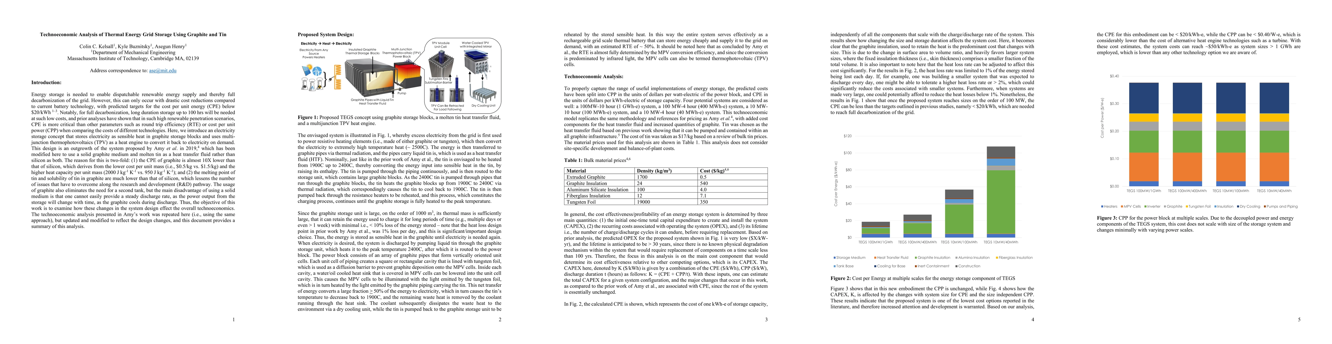 Energy storage is needed to enable dispatchable renewable energy supply and thereby full decarbonization of the grid. However, this can only occur with drastic cost reductions compared to current battery technology, with predicted targets for the cost per unit energy (CPE) below $20/kWh. Notably, for full decarbonization, long duration storage up to 100 hrs will be needed at such low costs, and prior analyses have shown that in such high renewable penetration scenarios, CPE is more critical than other parameters such as round trip efficiency or cost per unit power when comparing the costs of different technologies. Here, we introduce an electricity storage concept that stores electricity as sensible heat in graphite storage blocks and uses multi-junction thermophotovoltaics (TPV) as a heat engine to convert it back to electricity on demand. This design is an outgrowth of the system proposed by Amy et al. in 2019, which has been modified here to use a solid graphite medium and molten tin as a heat transfer fluid rather than silicon as both. The reason for this is two-fold: (1) the CPE of graphite is almost 10X lower than that of silicon, which derives from the lower cost per unit mass (i.e., $0.5/kg vs. $1.5/kg) and the higher heat capacity per unit mass (2000 J/kg-K vs. 950 J/kg-K); and (2) the melting point tin and solubility of tin in graphite are much lower than that of silicon, which lessens the number of issues that have to overcome along the research and development pathway. The usage of graphite also eliminates the need for a second tank, but the main disadvantage of using a solid medium is that one cannot easily provide a steady discharge rate, as the power output from the storage will change with time, as the graphite cools during discharge. Thus, the objective of this work is to examine how these changes in the system design effect the overall technoeconomics.