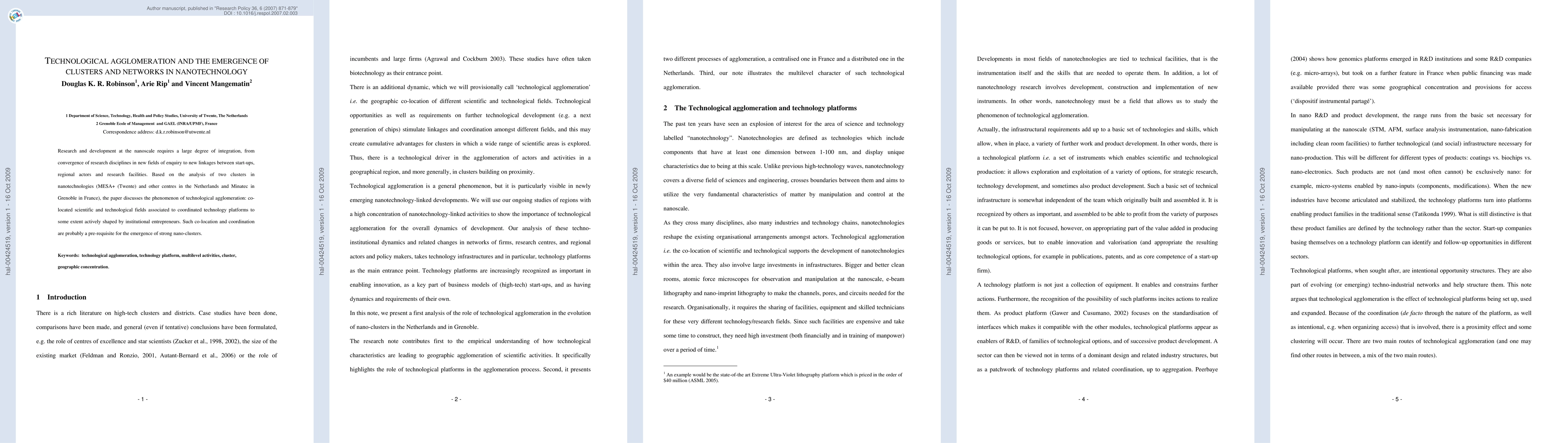 Research and development at the nanoscale requires a large degree of integration, from convergence of research disciplines in new fields of enquiry to new linkages between start-ups, regional actors and research facilities. Based on the analysis of two clusters in nanotechnologies (MESA+ (Twente) and other centres in The Netherlands and Minatec in Grenoble in France), the paper discusses the phenomenon of technological agglomeration: co-located scientific and technological fields associated to coordinated technology platforms to some extent actively shaped by institutional entrepreneurs. Such co-location and coordination are probably a prerequisite for the emergence of strong nanoclusters