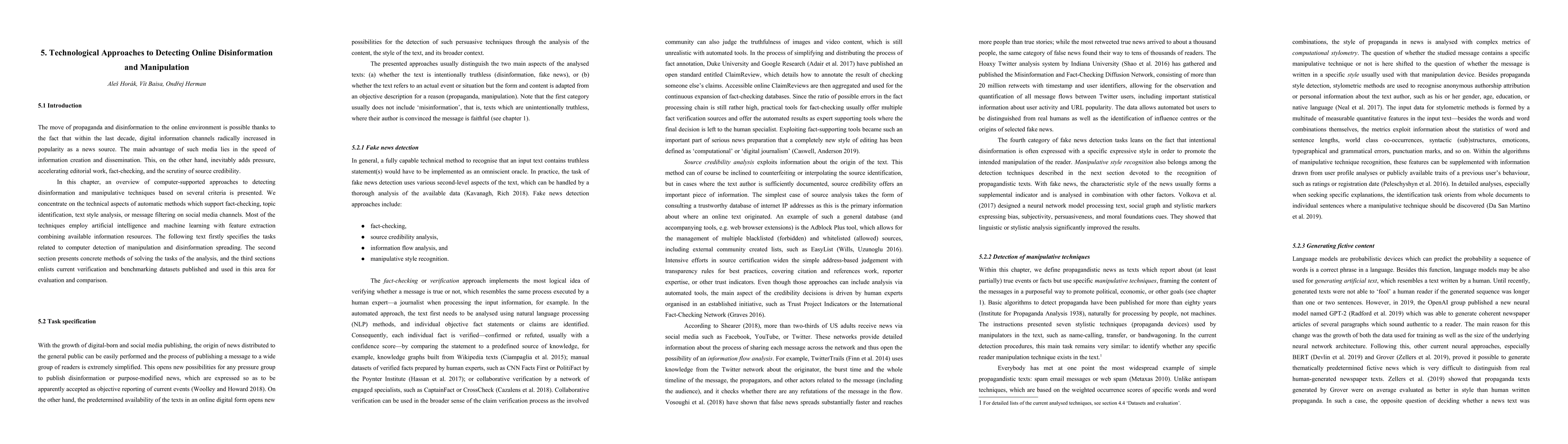 The move of propaganda and disinformation to the online environment is possible thanks to the fact that within the last decade, digital information channels radically increased in popularity as a news source. The main advantage of such media lies in the speed of information creation and dissemination. This, on the other hand, inevitably adds pressure, accelerating editorial work, fact-checking, and the scrutiny of source credibility. In this chapter, an overview of computer-supported approaches to detecting disinformation and manipulative techniques based on several criteria is presented. We concentrate on the technical aspects of automatic methods which support fact-checking, topic identification, text style analysis, or message filtering on social media channels. Most of the techniques employ artificial intelligence and machine learning with feature extraction combining available information resources. The following text firstly specifies the tasks related to computer detection of manipulation and disinformation spreading. The second section presents concrete methods of solving the tasks of the analysis, and the third sections enlists current verification and benchmarking datasets published and used in this area for evaluation and comparison.