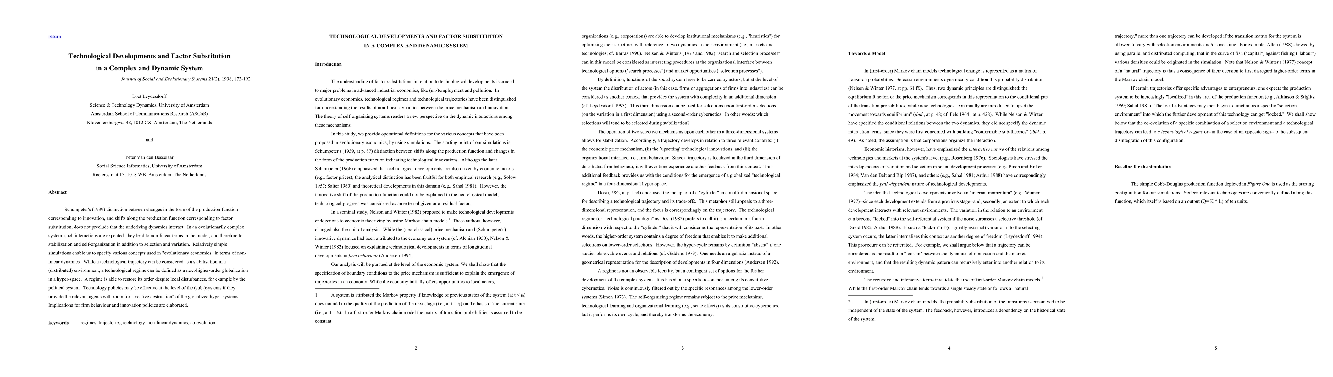 This research paper explores how technological developments and factor substitution interact in complex economic systems, leading to stabilization and self-organization through non-linear dynamics. It highlights the importance of technology policies that provide room for 'creative destruction' to support innovation and firm behavior.