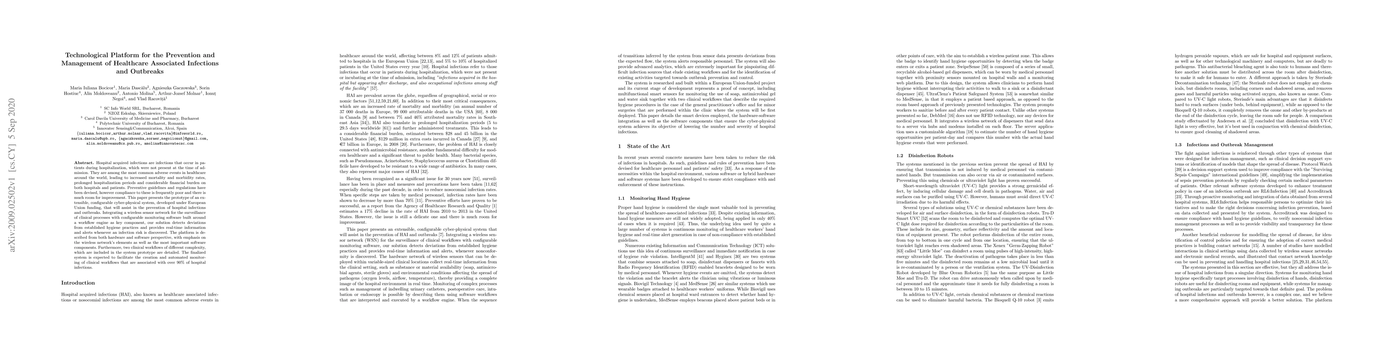 Hospital acquired infections are infections that occur in patients during hospitalization, which were not present at the time of admission. They are among the most common adverse events in healthcare around the world, leading to increased mortality and morbidity rates, prolonged hospitalization periods and considerable financial burden on both hospitals and patients. Preventive guidelines and regulations have been devised, however compliance to these is frequently poor and there is much room for improvement. This paper presents the prototype of an extensible, configurable cyber-physical system, developed under European Union funding, that will assist in the prevention of hospital infections and outbreaks. Integrating a wireless sensor network for the surveillance of clinical processes with configurable monitoring software built around a workflow engine as key component, our solution detects deviations from established hygiene practices and provides real-time information and alerts whenever an infection risk is discovered. The platform is described from both hardware and software perspective, with emphasis on the wireless network's elements as well as the most important software components. Furthermore, two clinical workflows of different complexity, which are included in the system prototype are detailed. The finalized system is expected to facilitate the creation and automated monitoring of clinical workflows that are associated with over 90% of hospital infections.