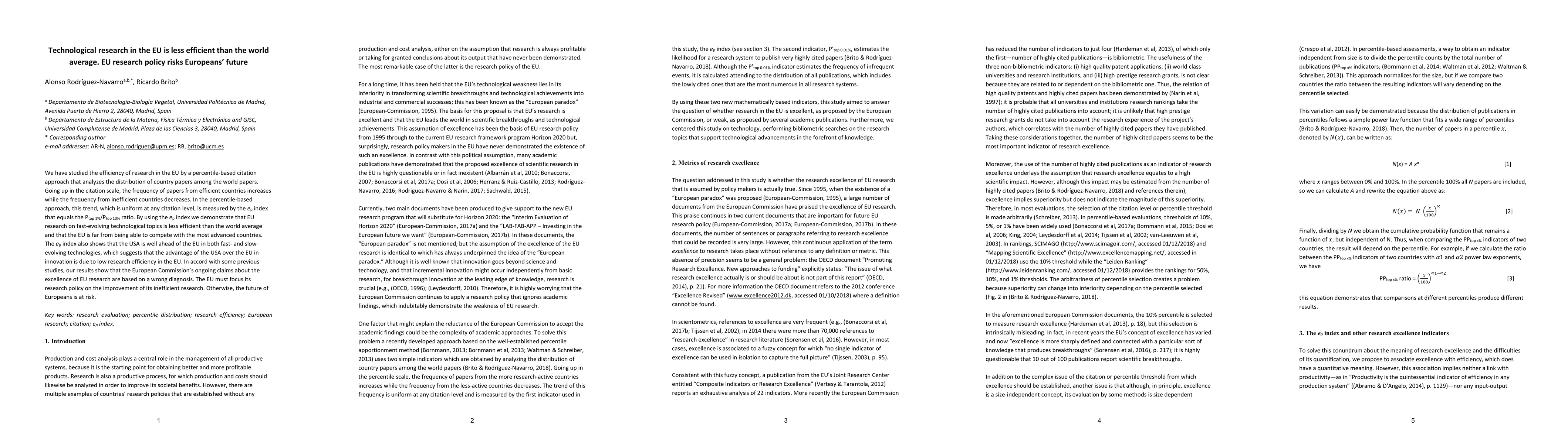 We have studied the efficiency of research in the EU by a percentile-based citation approach that analyzes the distribution of country papers among the world papers. Going up in the citation scale, the frequency of papers from efficient countries increases while the frequency from inefficient countries decreases. In the percentile-based approach, this trend, which is permanent at any citation level, is measured by the ep index that equals the Ptop 1%/Ptop 10% ratio. By using the ep index we demonstrate that EU research on fast-evolving technological topics is less efficient than the world average and that the EU is far from being able to compete with the most advanced countries. The ep index also shows that the USA is well ahead of the EU in both fast- and slow-evolving technologies, which suggests that the advantage of the USA over the EU in innovation is due to low research efficiency in the EU. In accord with some previous studies, our results show that the European Commission's ongoing claims about the excellence of EU research are based on a wrong diagnosis. The EU must focus its research policy on the improvement of its inefficient research. Otherwise, the future of Europeans is at risk.