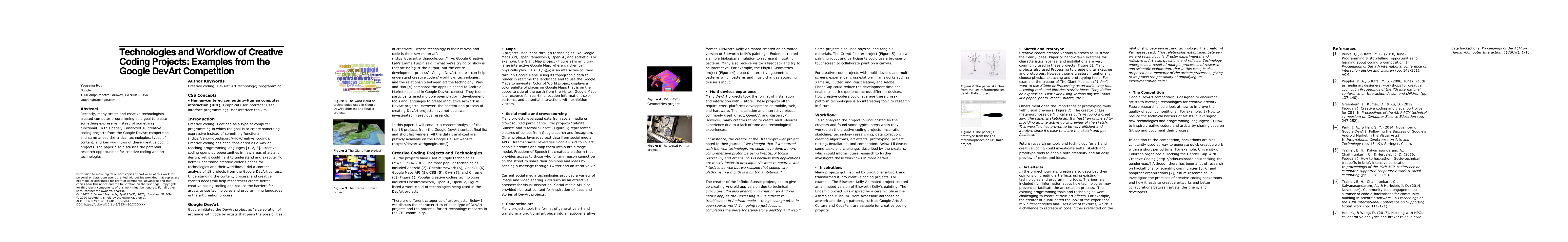 Recently, many artists and creative technologists created computer programming as a goal to create something expressive instead of something functional. In this paper, I analyzed 18 creative coding projects from the Google DevArt competition and summarized the critical technologies, types of content, and key workflows of these creative coding projects. The paper also discusses the potential research opportunities for creative coding and art technologies.
