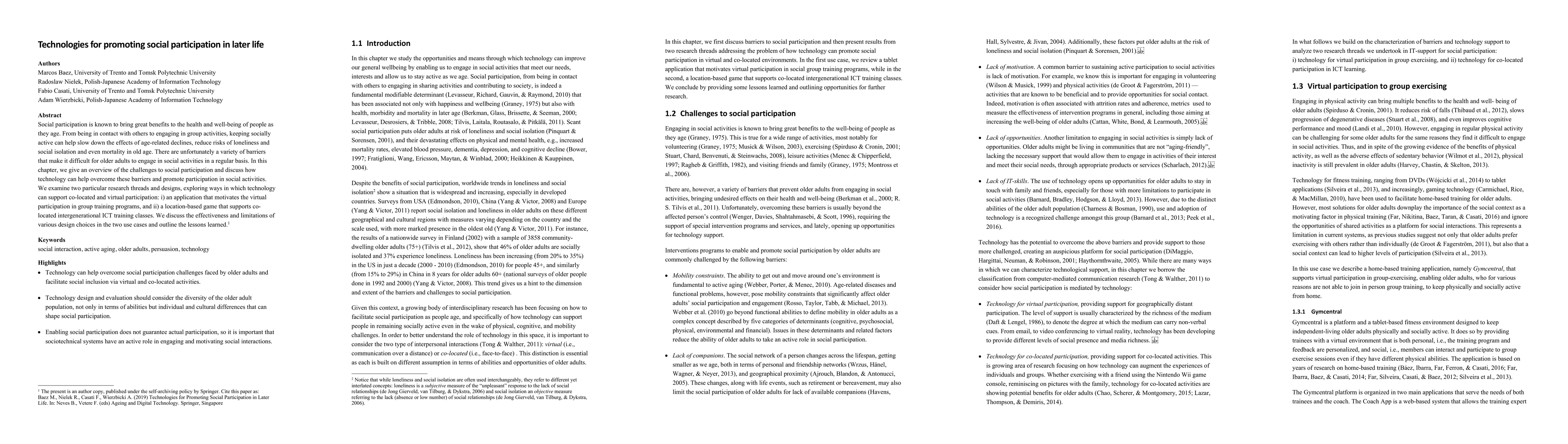 Gymcentral's design incorporates individual and social persuasion strategies to enhance engagement and adherence to physical exercise programs, demonstrating the effectiveness of persuasive technology in promoting social participation in later life.
