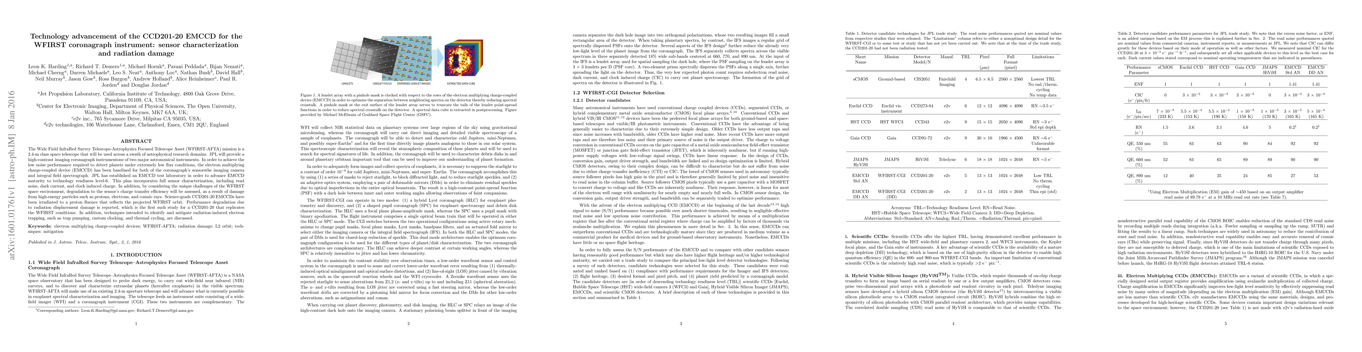 This paper details the advanced technology and characterization of the CCD201-20 EMCCD for the WFIRST coronagraph instrument, focusing on sensor performance and radiation damage assessment in the space environment. Techniques for mitigating radiation-induced electron trapping and performance degradation are also explored.