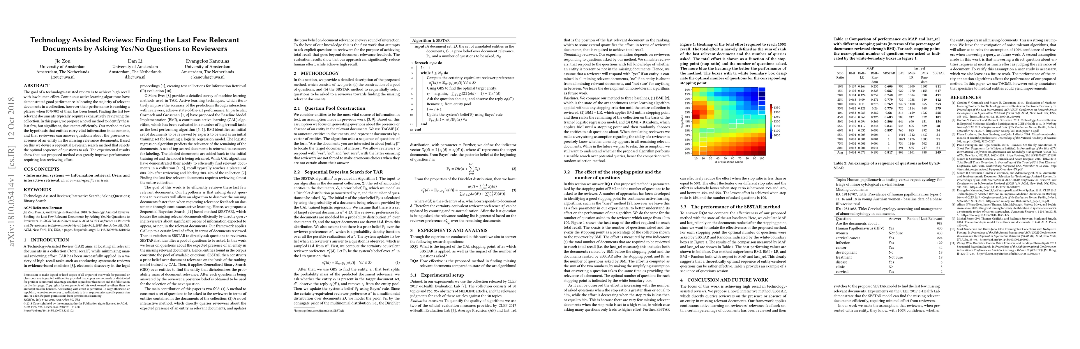 A new method uses Bayesian search to ask reviewers yes/no questions about entities in documents to efficiently find the last few relevant documents with minimal reviewing effort. This approach greatly improves performance while requiring less reviewer input.