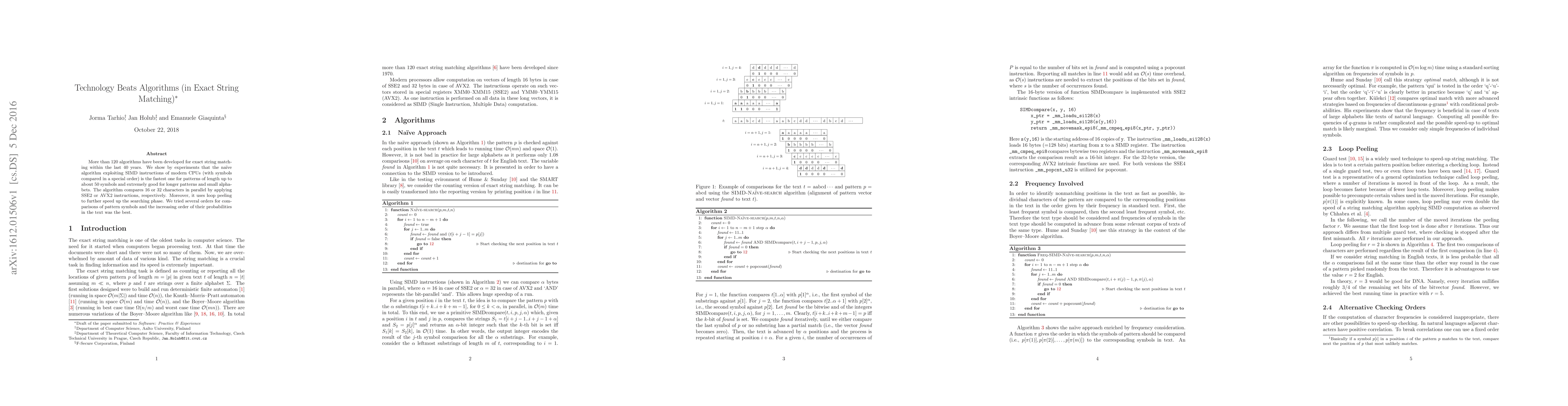 A simple algorithm using SIMD instructions outperforms existing algorithms for exact string matching, especially for longer patterns and small alphabets, with optimal results found when comparing symbols in a special order.