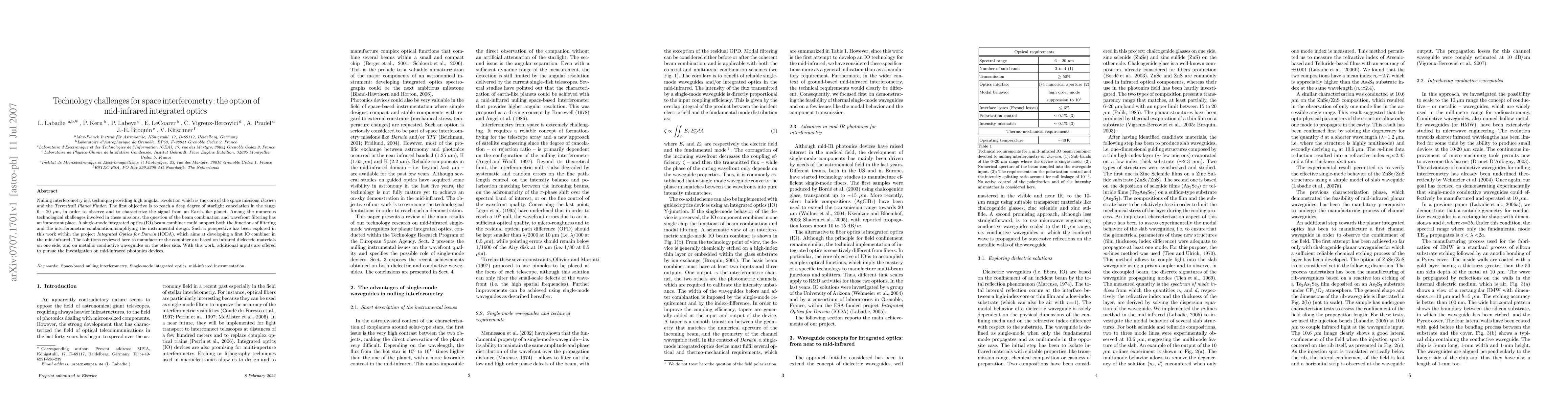This paper explores the technological challenges of nulling interferometry for space missions like Darwin and Terrestrial Planet Finder, focusing on mid-infrared integrated optics. It proposes a single-mode integrated optics beam combiner to simplify design and enhance starlight cancellation, aiming to observe Earth-like planets.