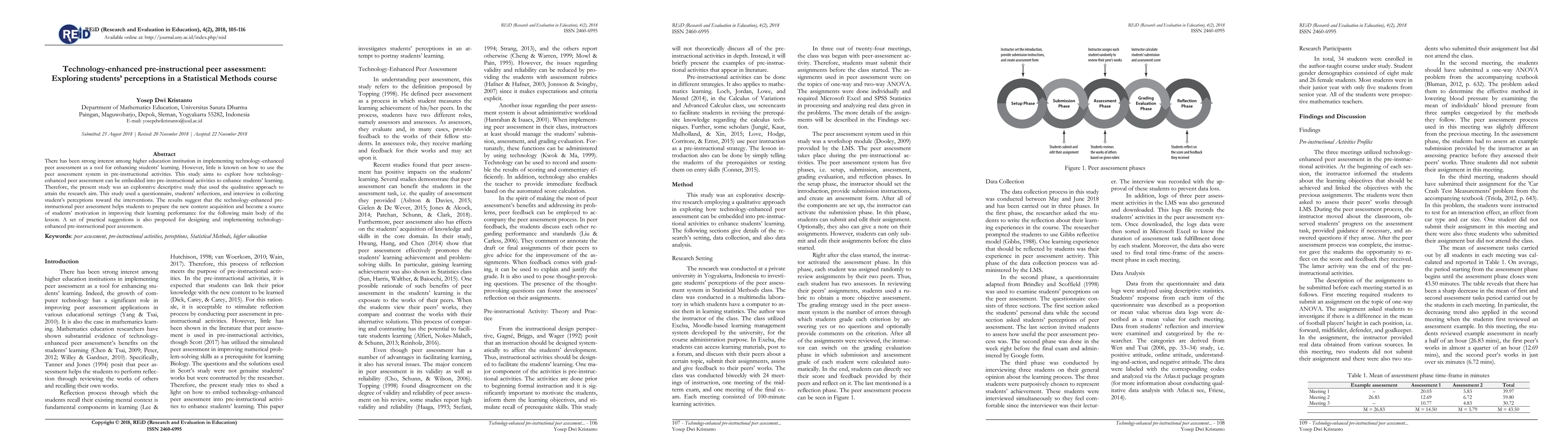 This study explores students' perceptions of technology-enhanced pre-instructional peer assessment in a Statistical Methods course, finding it beneficial for content preparation and motivation. Practical suggestions for its design and implementation are proposed.