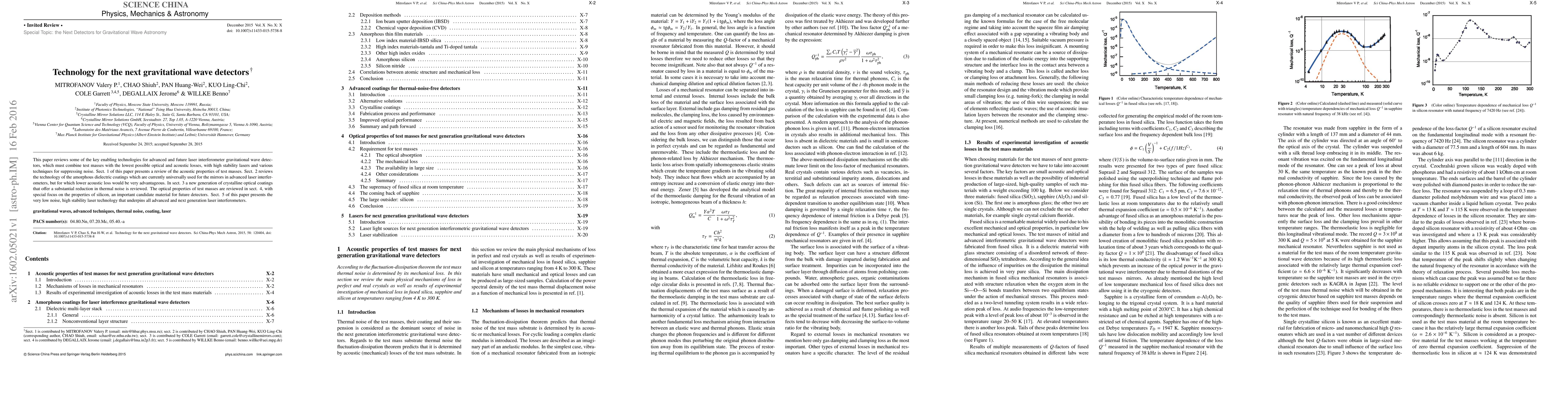This paper reviews key technologies for next-generation gravitational wave detectors, focusing on low-loss test masses, advanced laser stability, and noise-suppression techniques. It covers amorphous dielectric coatings, crystalline optical coatings, silicon material properties, and low-noise laser technology.