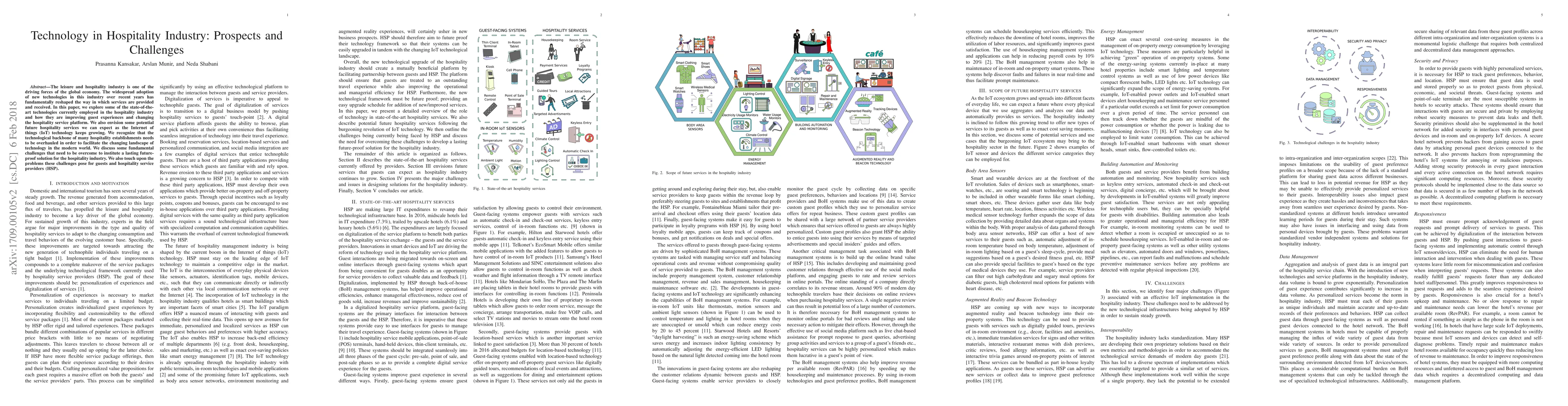 The leisure and hospitality industry is one of the driving forces of the global economy. The widespread adoption of new technologies in this industry over recent years has fundamentally reshaped the way in which services are provided and received. In this paper, we explore some of the state-of-the-art technologies currently employed in the hospitality industry and how they are improving guest experiences and changing the hospitality service platform. We also envision some potential future hospitality services we can expect as the Internet of things (IoT) technology keeps growing. We recognize that the technological backbone of many hospitality establishments needs to be overhauled in order to facilitate the changing landscape of technology in the modern world. We discuss some fundamental challenges that need to be overcome to institute a lasting future-proof solution for the hospitality industry. We also touch upon the problems these challenges pose for guests and hospitality service providers (HSP).