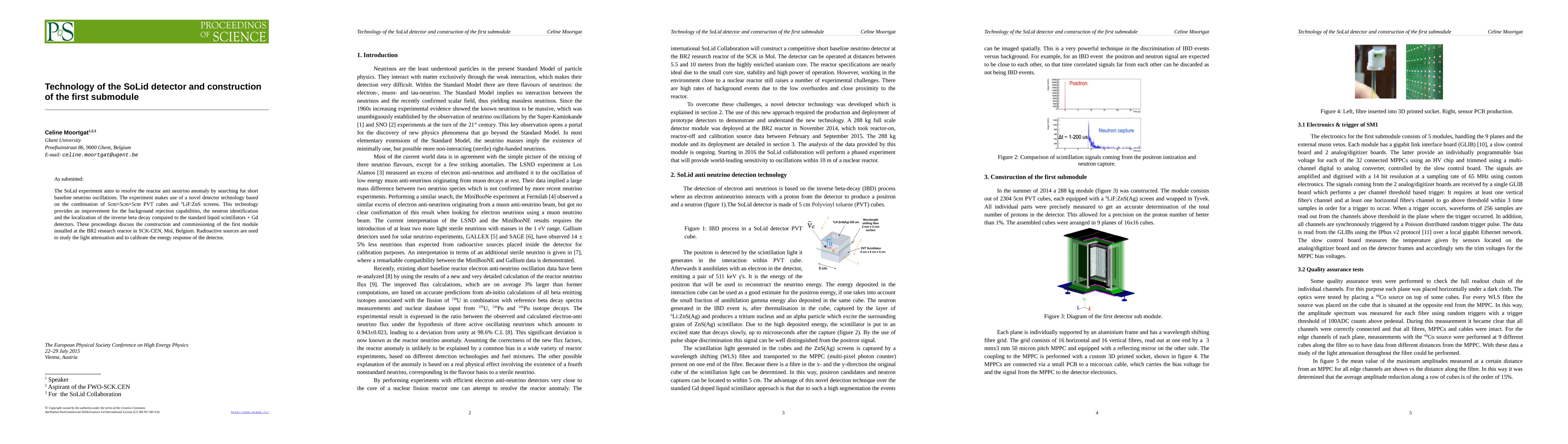 The SoLid experiment uses innovative detector technology to search for short baseline neutrino oscillations, improving background rejection and neutron identification capabilities. The first module has been successfully constructed and commissioned at the BR2 research reactor in Belgium.