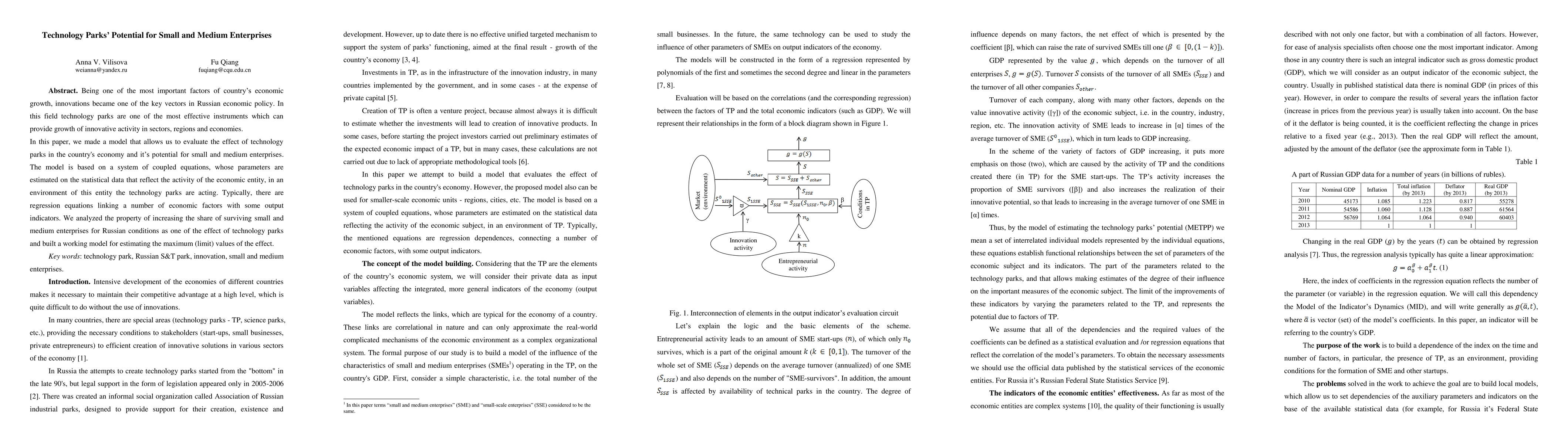 Being one of the most important factors of economic growth of the country, innovations became one of the key vectors in Russian economic policy. In this field technology parks are one of the most effective instruments which can provide growth of innovative activity in sectors, regions and economies. In this paper, we made a model that allows us to evaluate the effect of technology parks in the economy of the country and its potential for small and medium enterprises. The model is based on a system of coupled equations, whose parameters are estimated on the statistical data that reflect the activity of the economic entity, in an environment of this entity the technology parks are acting. Typically, there are regression equations linking a number of economic factors with some output indicators. We analyzed the property of increasing the share of surviving small and medium enterprises for Russian conditions as one of the effect of technology parks and built a working model for estimating the maximum (limit) values of the effect.