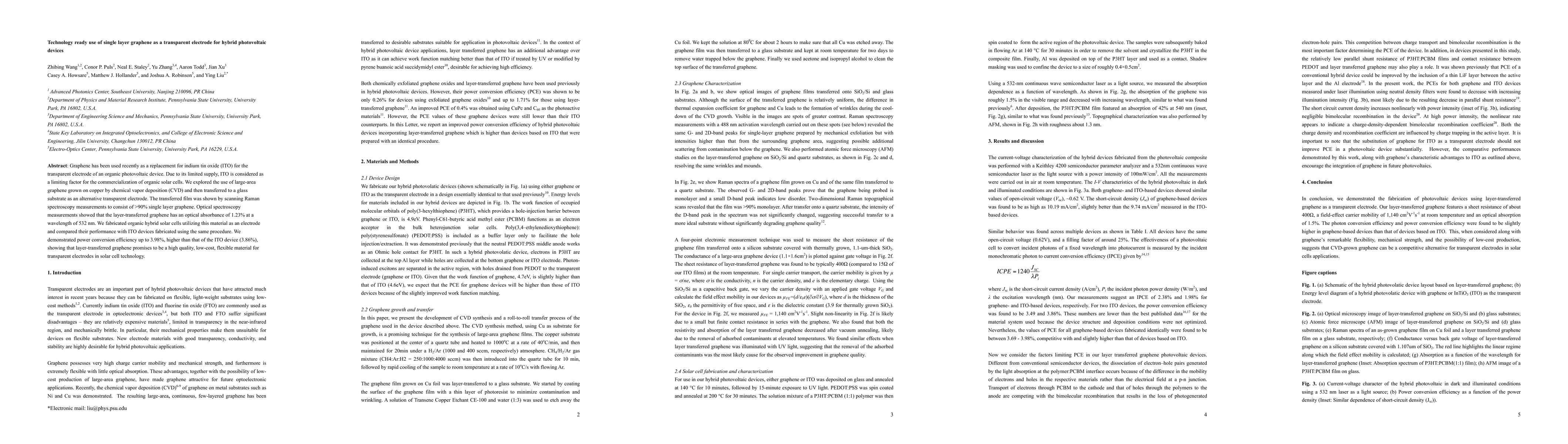 Graphene has been used recently as a replacement for indium tin oxide (ITO) for the transparent electrode of an organic photovoltaic device. Due to its limited supply, ITO is considered as a limiting factor for the commercialization of organic solar cells. We explored the use of large-area graphene grown on copper by chemical vapor deposition (CVD) and then transferred to a glass substrate as an alternative transparent electrode. The transferred film was shown by scanning Raman spectroscopy measurements to consist of >90% single layer graphene. Optical spectroscopy measurements showed that the layer-transferred graphene has an optical absorbance of 1.23% at a wavelength of 532 nm. We fabricated organic hybrid solar cells utilizing this material as an electrode and compared their performance with ITO devices fabricated using the same procedure. We demonstrated power conversion efficiency up to 3.98%, higher than that of the ITO device (3.86%), showing that layer-transferred graphene promises to be a high quality, low-cost, flexible material for transparent electrodes in solar cell technology.