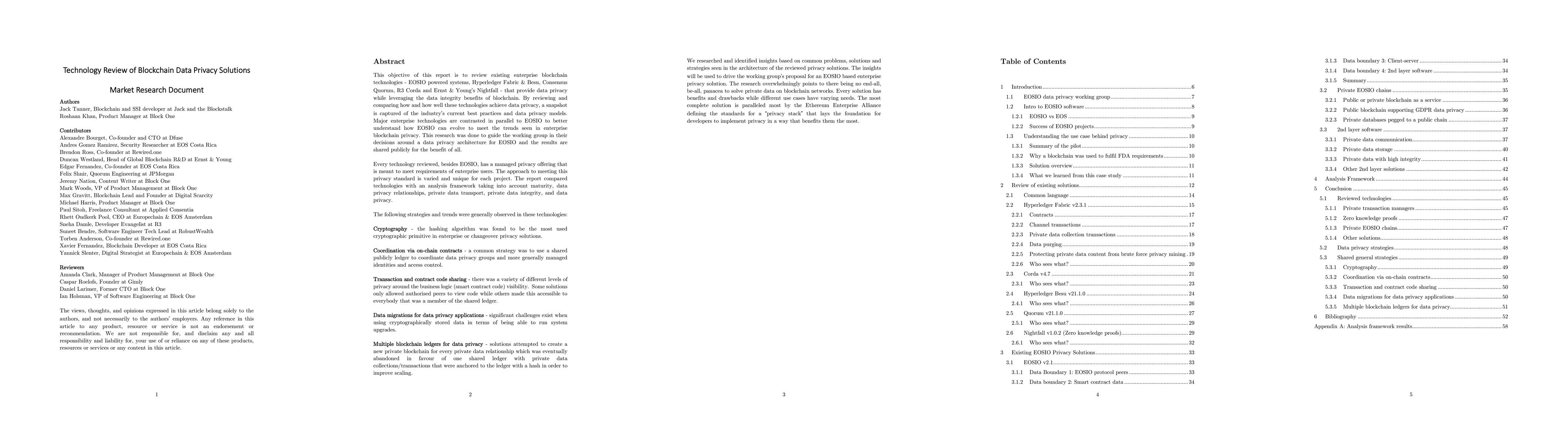 This objective of this report is to review existing enterprise blockchain technologies - EOSIO powered systems, Hyperledger Fabric and Besu, Consensus Quorum, R3 Corda and Ernst and Young's Nightfall - that provide data privacy while leveraging the data integrity benefits of blockchain. By reviewing and comparing how and how well these technologies achieve data privacy, a snapshot is captured of the industry's current best practices and data privacy models. Major enterprise technologies are contrasted in parallel to EOSIO to better understand how EOSIO can evolve to meet the trends seen in enterprise blockchain privacy. The following strategies and trends were generally observed in these technologies: Cryptography: the hashing algorithm was found to be the most used cryptographic primitive in enterprise or changeover privacy solutions. Coordination via on-chain contracts - a common strategy was to use a shared publicly ledger to coordinate data privacy groups and more generally managed identities and access control. Transaction and contract code sharing: there was a variety of different levels of privacy around the business logic (smart contract code) visibility. Some solutions only allowed authorised peers to view code while others made this accessible to everybody that was a member of the shared ledger. Data migrations for data privacy applications: significant challenges exist when using cryptographically stored data in terms of being able to run system upgrades. Multiple blockchain ledgers for data privacy: solutions attempted to create a new private blockchain for every private data relationship which was eventually abandoned in favour of one shared ledger with private data collections/transactions that were anchored to the ledger with a hash in order to improve scaling.