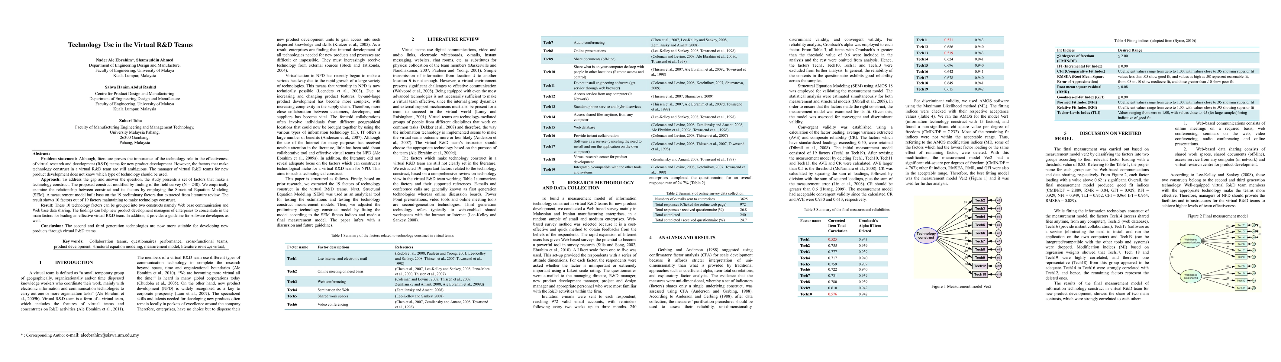 Problem statement: Although, literature proves the importance of the technology role in the effectiveness of virtual Research and Development (R&D) teams for new product development. However, the factors that make technology construct in a virtual R&D team are still ambiguous. The manager of virtual R&D teams for new product development does not know which type of technology should be used. Approach: To address the gap and answer the question, the study presents a set of factors that make a technology construct. The proposed construct modified by finding of the field survey (N = 240). We empirically examine the relationship between construct and its factors by employing the Structural Equation Modeling (SEM). A measurement model built base on the 19 preliminary factors that extracted from literature review. The result shows 10 factors out of 19 factors maintaining to make technology construct. Results: These 10 technology factors can be grouped into two constructs namely Web base communication and Web base data sharing. The findings can help new product development managers of enterprises to concentrate in the main factors for leading an effective virtual R&D team. In addition, it provides a guideline for software developers as well. Conclusion: The second and third generation technologies are now more suitable for developing new products through virtual R&D teams.