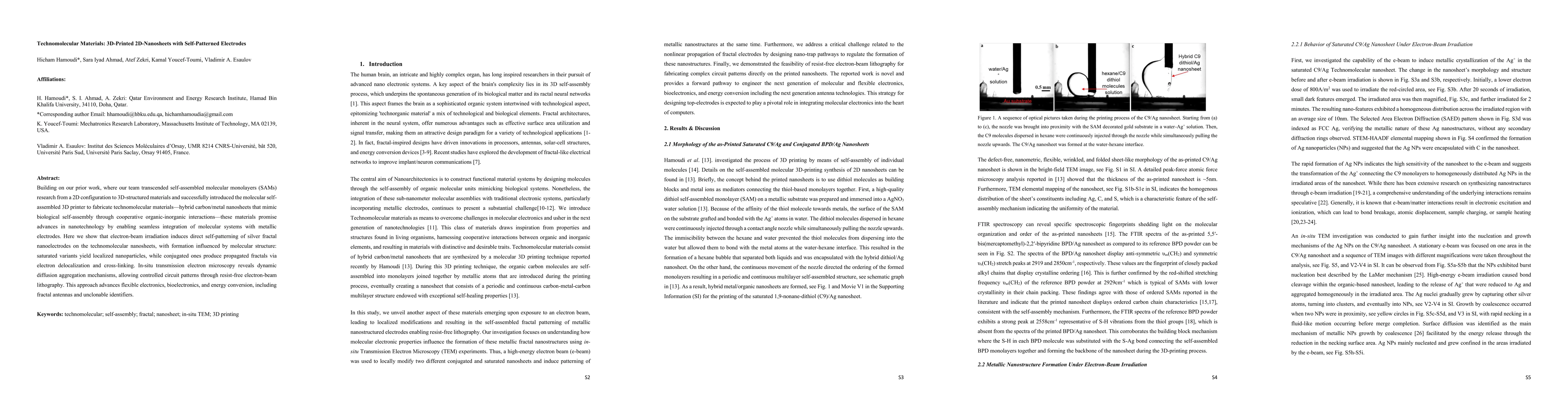 Building on our prior work, where our team transcended self assembled molecular monolayers (SAMs) research from a 2D configuration to 3D structured materials and successfully introduced the molecular self assembled 3D printer to fabricate technomolecular materials hybrid carbon metal nanosheets that mimic biological self assembly through cooperative organic inorganic interactions these materials promise advances in nanotechnology by enabling seamless integration of molecular systems with metallic electrodes. Here we show that electron beam irradiation induces direct self patterning of silver fractal nanoelectrodes on the technomolecular nanosheets, with formation influenced by molecular structure: saturated variants yield localized nanoparticles, while conjugated ones produce propagated fractals via electron delocalization and cross linking. In situ transmission electron microscopy reveals dynamic diffusion aggregation mechanisms, allowing controlled circuit patterns through resist free electron beam lithography. This approach advances flexible electronics, bioelectronics, and energy conversion, including fractal antennas and unclonable identifiers.