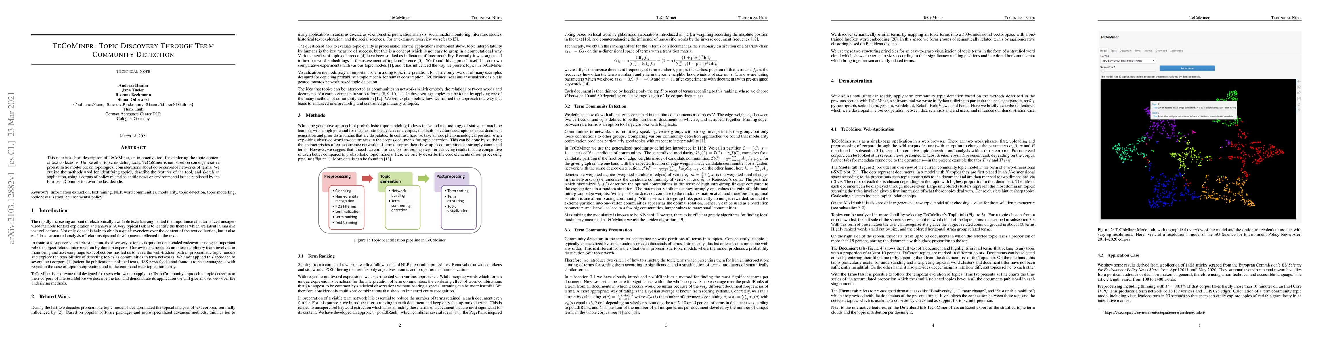 This note is a short description of TeCoMiner, an interactive tool for exploring the topic content of text collections. Unlike other topic modeling tools, TeCoMiner is not based on some generative probabilistic model but on topological considerations about co-occurrence networks of terms. We outline the methods used for identifying topics, describe the features of the tool, and sketch an application, using a corpus of policy related scientific news on environmental issues published by the European Commission over the last decade.