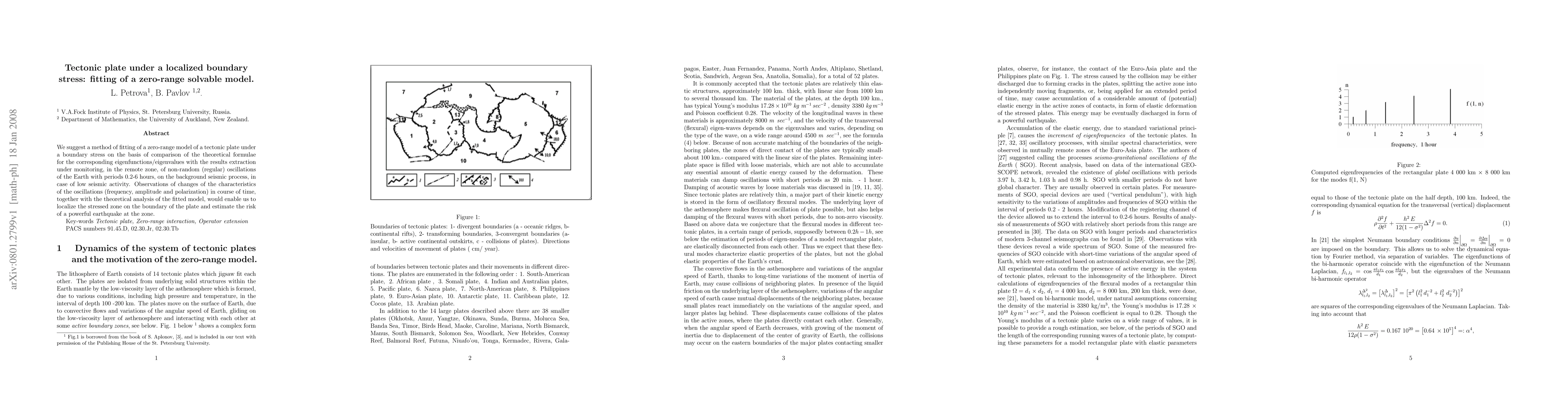 This paper proposes a zero-range model to fit tectonic plate stress under boundary conditions, comparing theoretical eigenfunctions with observed oscillations. Monitoring changes in oscillation characteristics over time can localize stressed zones and assess earthquake risk.