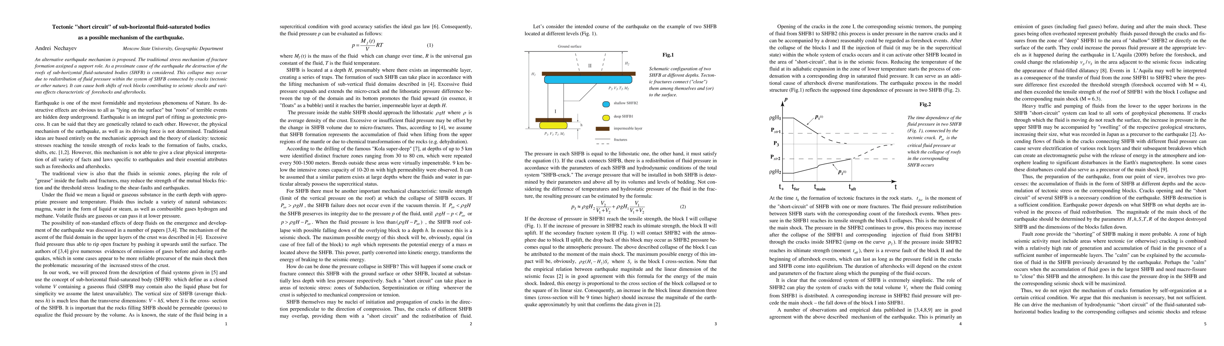 An alternative earthquake mechanism is proposed. The traditional stress mechanism of fracture formation assigned a support role. As a proximate cause of the earthquake the destruction of the roofs of sub-horizontal fluid-saturated bodies (SHFB) is considered. This collapse may occur due to redistribution of fluid pressure within the system of SHFB connected by cracks (tectonic or other nature). It can cause both shifts of rock blocks contributing to seismic shocks and various effects characteristic of foreshocks and aftershocks.