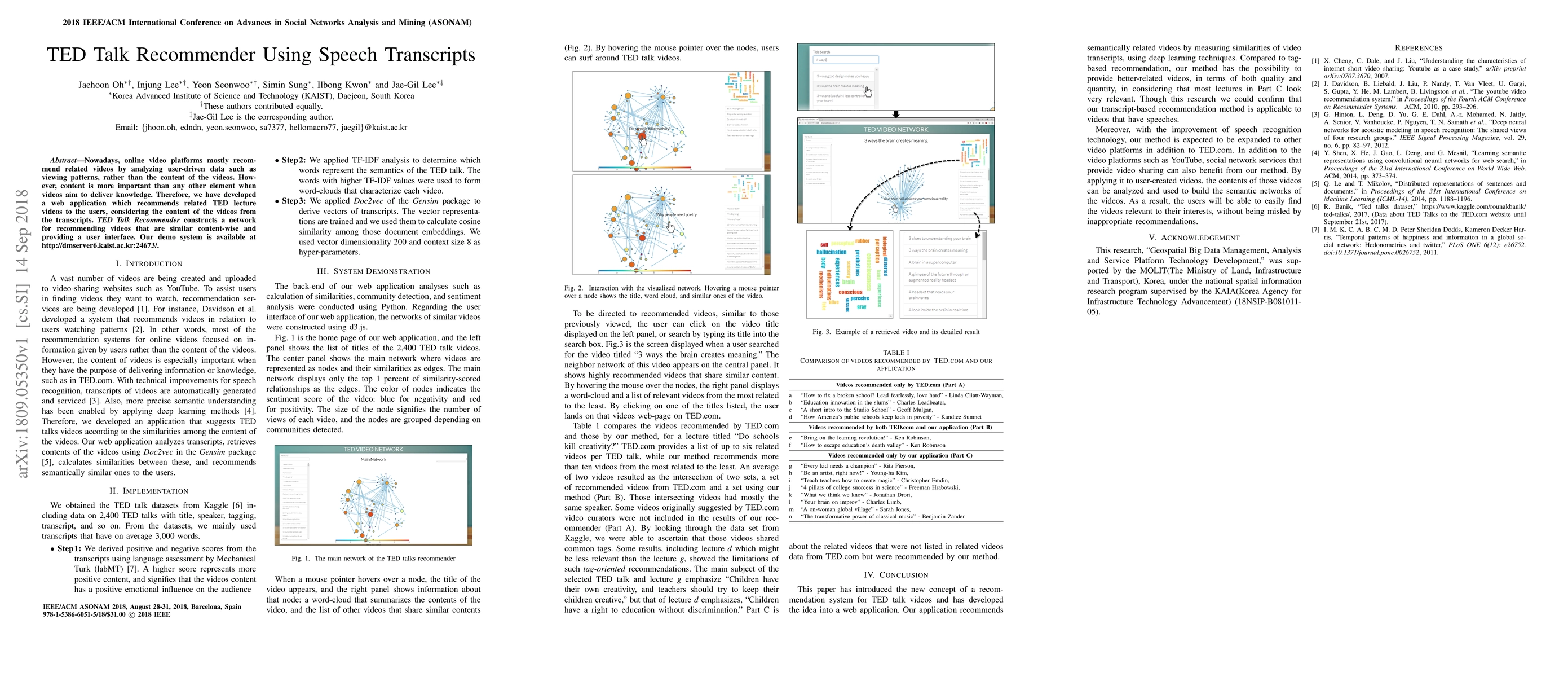 A web application recommends related TED lecture videos based on content similarity, using speech transcripts from existing talks. This approach focuses on delivering knowledge over viewing patterns, improving user experience and content discovery.