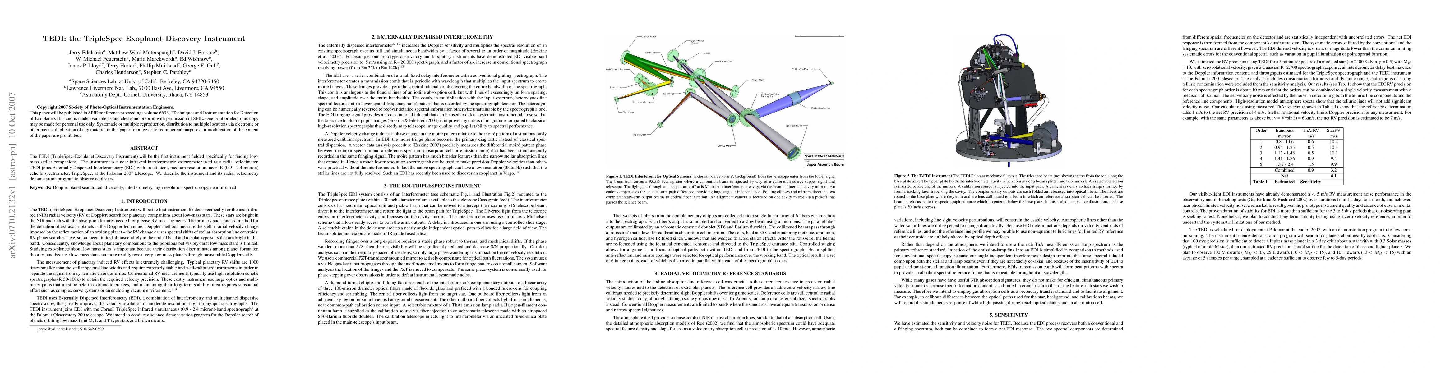TEDI (TripleSpec Exoplanet Discovery Instrument) is a near-infrared interferometric spectrometer designed to detect low-mass stellar companions. It combines Externally Dispersed Interferometry with a medium-resolution echelle spectrometer and is deployed on the Palomar 200" telescope for radial velocimetry of cool stars.