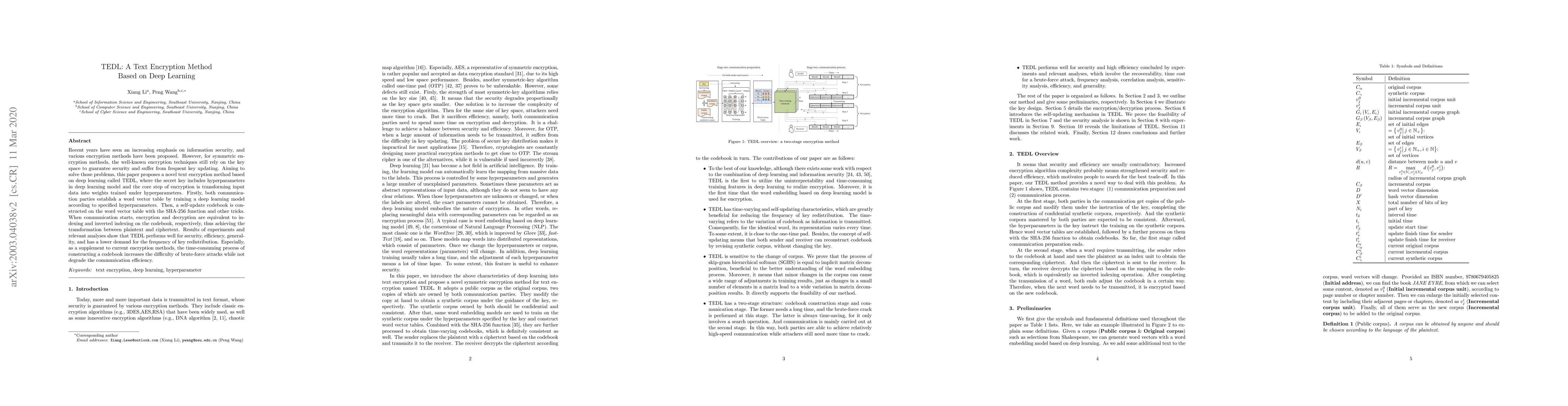 This paper proposes TEDL, a text encryption method based on deep learning, which uses hyperparameters as a secret key and transforms input data into weights trained under these hyperparameters. TEDL enhances security and efficiency by constructing a self-update codebook, reducing the need for frequent key updates and improving resistance to brute-force attacks.