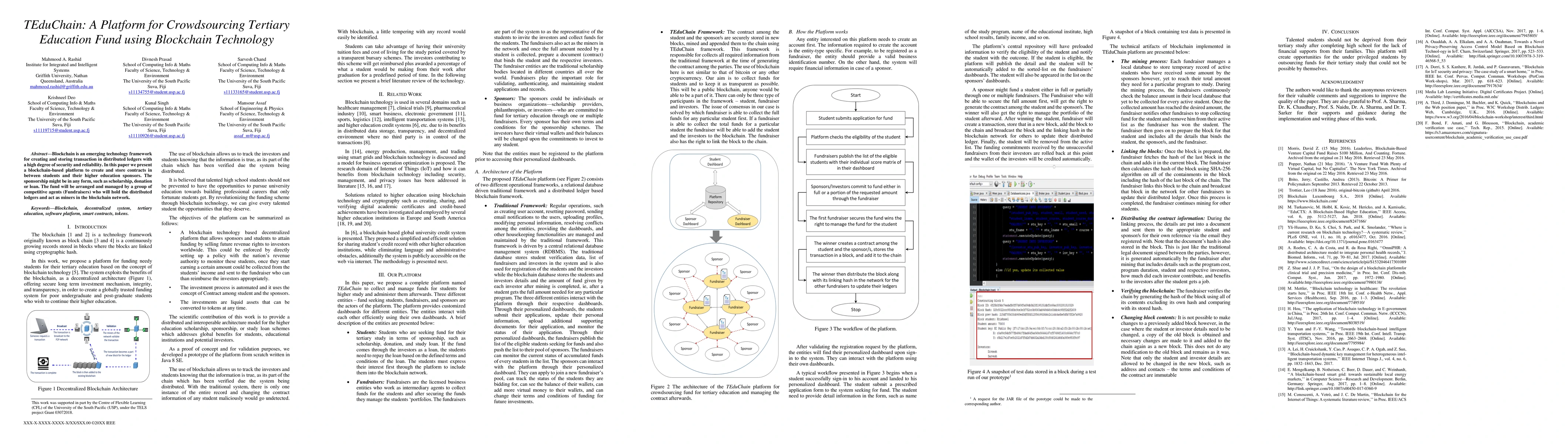 TEduChain leverages blockchain technology to create a decentralized platform for managing tertiary education funds through crowdsourcing, ensuring secure and transparent contracts between students and sponsors. Competitive agents, acting as miners, facilitate fund arrangement and management within the distributed ledger.