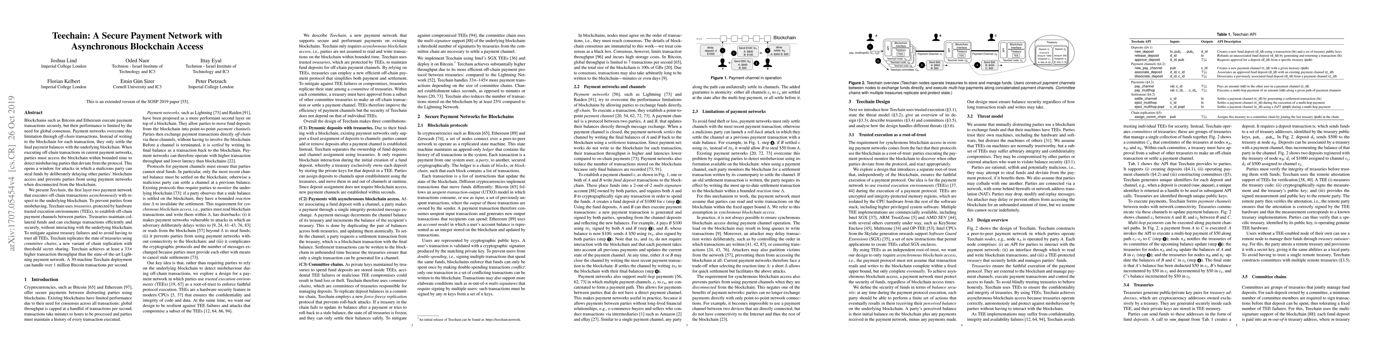 Teechain introduces a secure layer-two payment network that enables asynchronous off-chain transactions without requiring real-time blockchain access, using treasuries protected by hardware trusted execution environments to maintain payment channels. It achieves significantly higher transaction throughput than existing solutions by employing committee chains for state replication and threshold secret sharing.