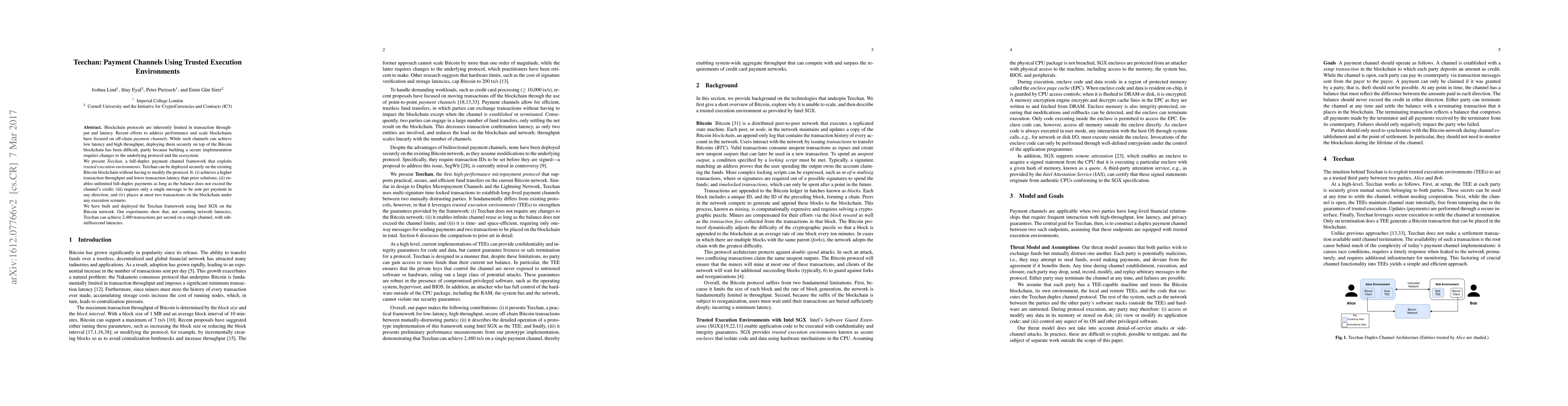 Teechan is a full-duplex payment channel framework that leverages Trusted Execution Environments (TEEs) to securely and efficiently process payments on the Bitcoin network without requiring protocol modifications.