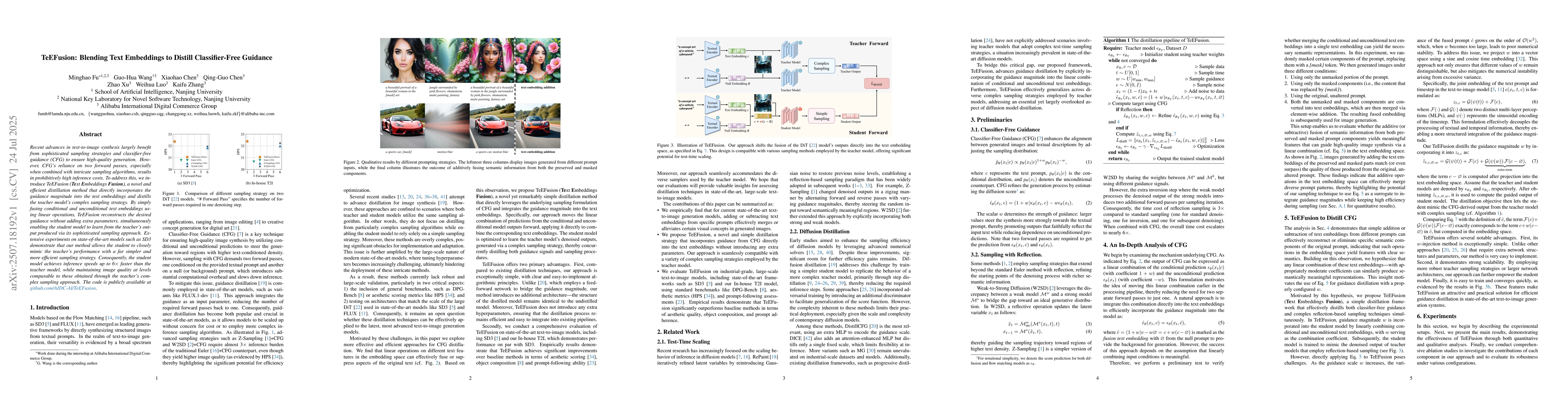 Recent advances in text-to-image synthesis largely benefit from sophisticated sampling strategies and classifier-free guidance (CFG) to ensure high-quality generation. However, CFG's reliance on two forward passes, especially when combined with intricate sampling algorithms, results in prohibitively high inference costs. To address this, we introduce TeEFusion (\textbf{Te}xt \textbf{E}mbeddings \textbf{Fusion}), a novel and efficient distillation method that directly incorporates the guidance magnitude into the text embeddings and distills the teacher model's complex sampling strategy. By simply fusing conditional and unconditional text embeddings using linear operations, TeEFusion reconstructs the desired guidance without adding extra parameters, simultaneously enabling the student model to learn from the teacher's output produced via its sophisticated sampling approach. Extensive experiments on state-of-the-art models such as SD3 demonstrate that our method allows the student to closely mimic the teacher's performance with a far simpler and more efficient sampling strategy. Consequently, the student model achieves inference speeds up to 6$\times$ faster than the teacher model, while maintaining image quality at levels comparable to those obtained through the teacher's complex sampling approach. The code is publicly available at \href{https://github.com/AIDC-AI/TeEFusion}{github.com/AIDC-AI/TeEFusion}.