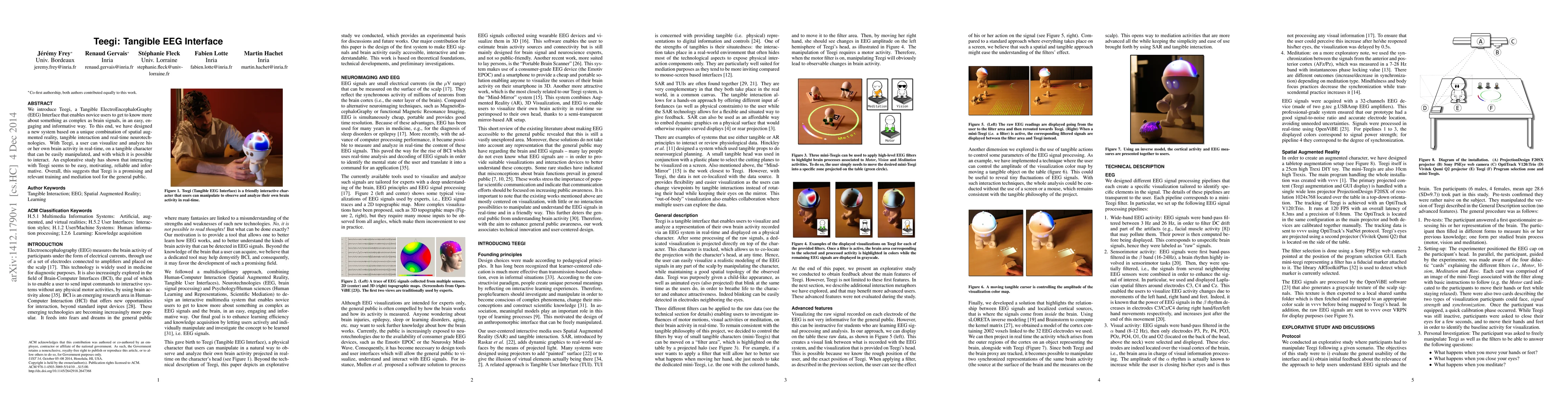 We introduce Teegi, a Tangible ElectroEncephaloGraphy (EEG) Interface that enables novice users to get to know more about something as complex as brain signals, in an easy, en- gaging and informative way. To this end, we have designed a new system based on a unique combination of spatial aug- mented reality, tangible interaction and real-time neurotech- nologies. With Teegi, a user can visualize and analyze his or her own brain activity in real-time, on a tangible character that can be easily manipulated, and with which it is possible to interact. An exploration study has shown that interacting with Teegi seems to be easy, motivating, reliable and infor- mative. Overall, this suggests that Teegi is a promising and relevant training and mediation tool for the general public.