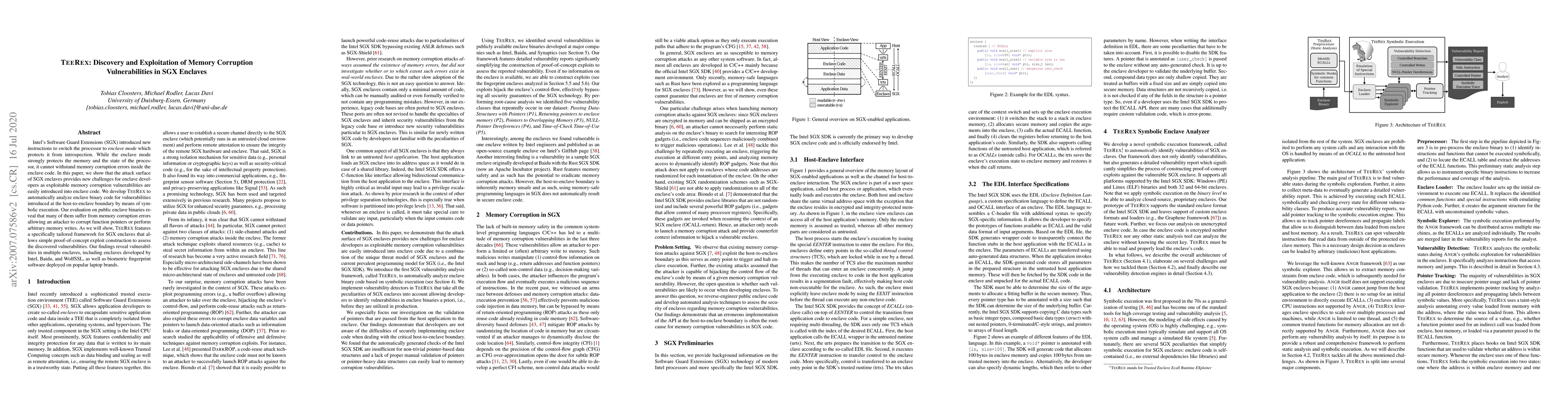 Researchers found that Intel's SGX enclaves are vulnerable to memory corruption errors, which can be exploited to access sensitive data. A new tool called TeeRex was developed to automatically analyze enclave code for these vulnerabilities.