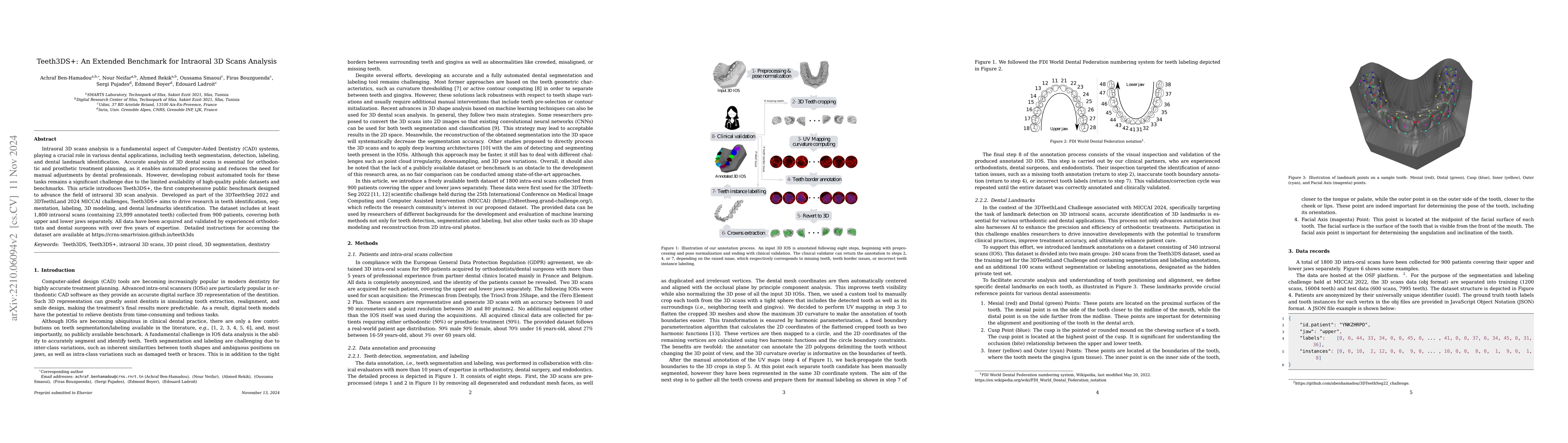 The paper introduces Teeth3DS, a new benchmark for teeth segmentation and labeling from intra-oral 3D scans, aiming to facilitate research in Computer-Aided Dentistry. The dataset includes 1800 scans with 23,999 annotated teeth, created to inspire advancements in automated dental analysis.