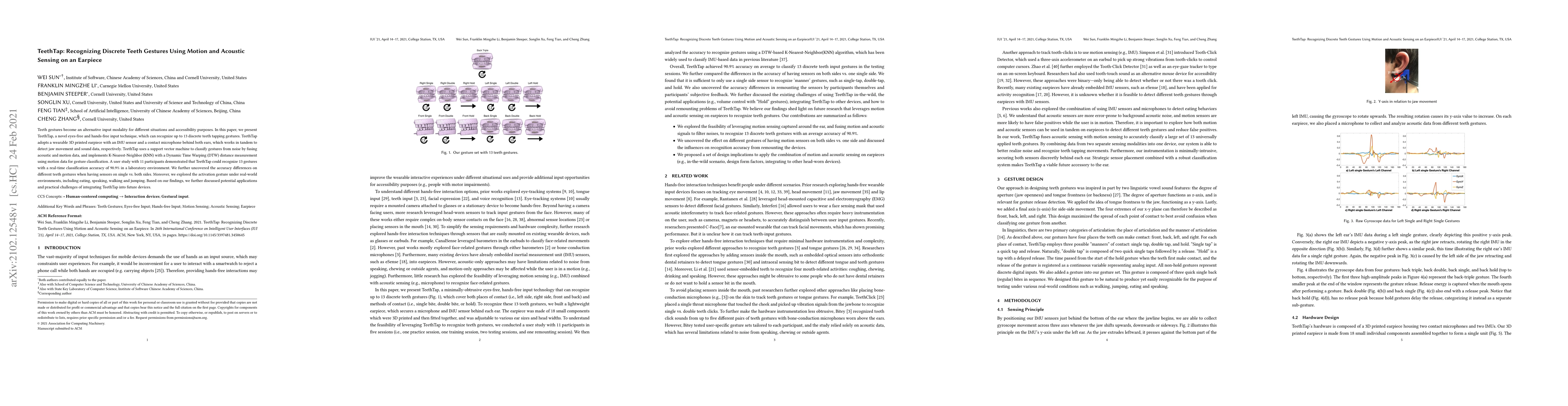 TeethTap is an innovative eyes-free and hands-free input method using an earpiece with IMU and contact microphones to recognize 13 discrete teeth gestures. The system achieved 90.9% real-time classification accuracy in a lab setting, with potential applications and challenges discussed for real-world use.