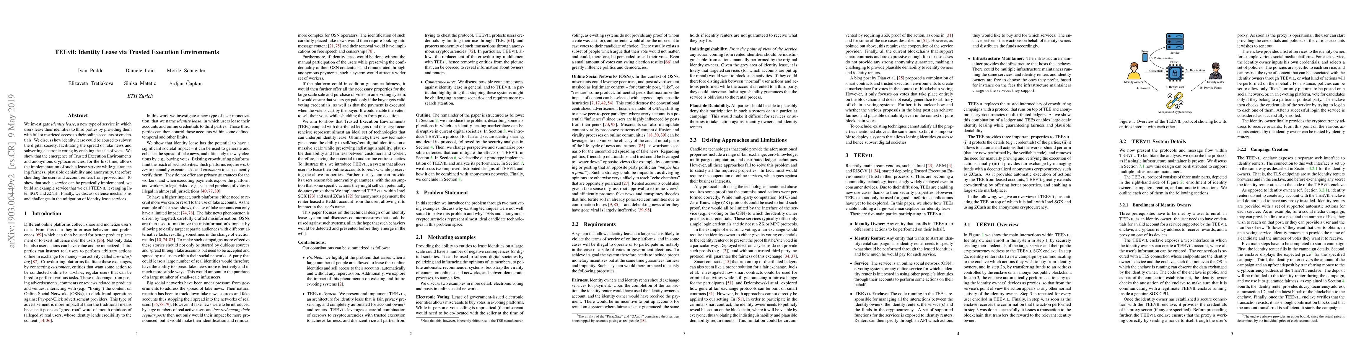 We investigate identity lease, a new type of service in which users lease their identities to third parties by providing them with full or restricted access to their online accounts or credentials. We discuss how identity lease could be abused to subvert the digital society, facilitating the spread of fake news and subverting electronic voting by enabling the sale of votes. We show that the emergence of Trusted Execution Environments and anonymous cryptocurrencies, for the first time, allows the implementation of such a lease service while guaranteeing fairness, plausible deniability and anonymity, therefore shielding the users and account renters from prosecution. To show that such a service can be practically implemented, we build an example service that we call TEEvil leveraging Intel SGX and ZCash. Finally, we discuss defense mechanisms and challenges in the mitigation of identity lease services.