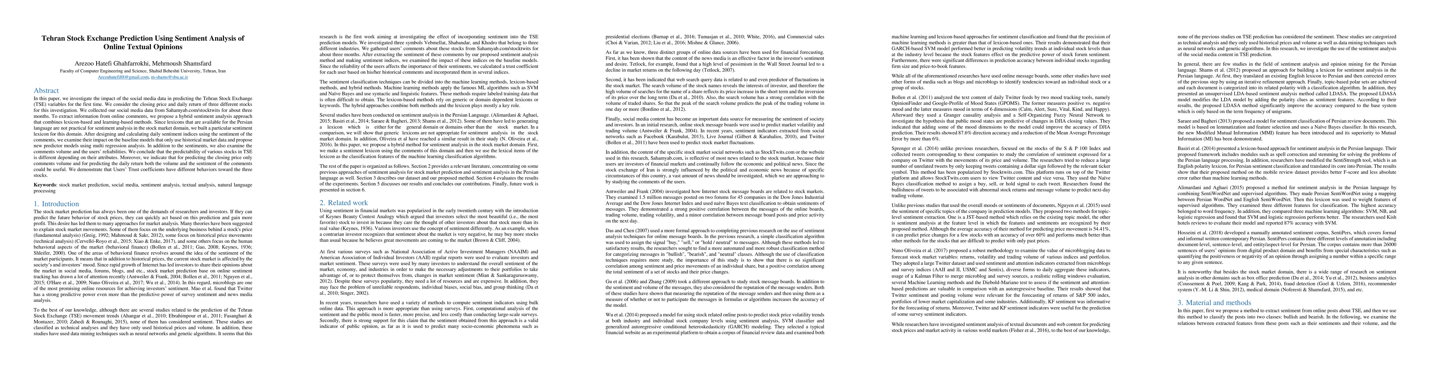 In this paper, we investigate the impact of the social media data in predicting the Tehran Stock Exchange (TSE) variables for the first time. We consider the closing price and daily return of three different stocks for this investigation. We collected our social media data from Sahamyab.com/stocktwits for about three months. To extract information from online comments, we propose a hybrid sentiment analysis approach that combines lexicon-based and learning-based methods. Since lexicons that are available for the Persian language are not practical for sentiment analysis in the stock market domain, we built a particular sentiment lexicon for this domain. After designing and calculating daily sentiment indices using the sentiment of the comments, we examine their impact on the baseline models that only use historical market data and propose new predictor models using multi regression analysis. In addition to the sentiments, we also examine the comments volume and the users' reliabilities. We conclude that the predictability of various stocks in TSE is different depending on their attributes. Moreover, we indicate that for predicting the closing price only comments volume and for predicting the daily return both the volume and the sentiment of the comments could be useful. We demonstrate that Users' Trust coefficients have different behaviors toward the three stocks.