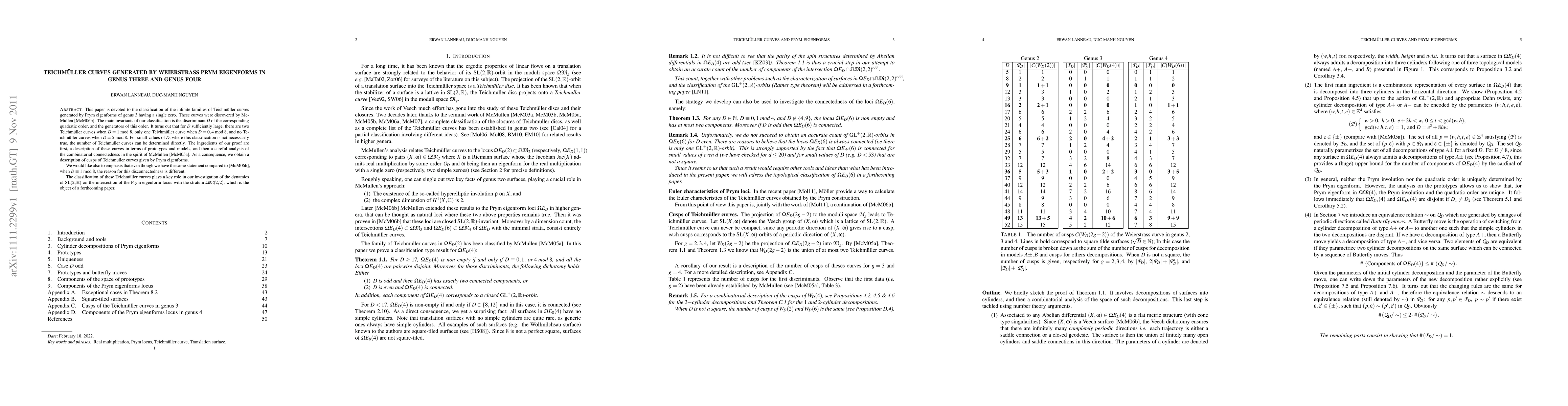 This paper classifies Teichmüller curves generated by Prym eigenforms in genus three, revealing the number of curves depends on the discriminant D of the associated quadratic order. For large D, there are two curves when D ≡ 1 (mod 8), one when D ≡ 0,4 (mod 8), and none when D ≡ 5 (mod 8). The study also outlines the cusps of these curves and hints at a forthcoming investigation into the dynamics of SL(2,R).
