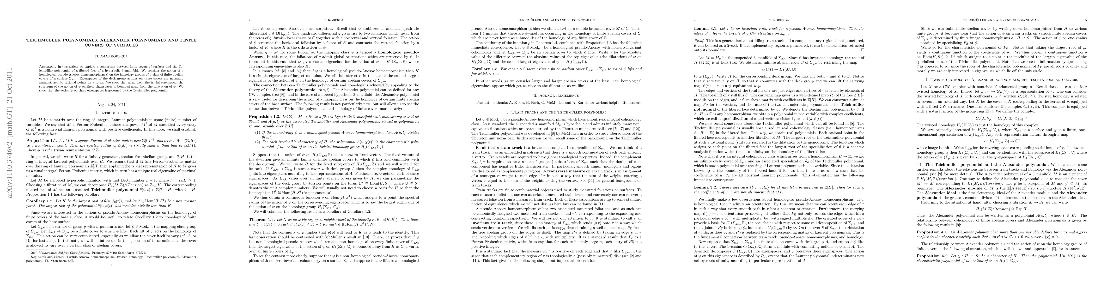 This paper establishes a link between finite abelian covers of surfaces and the Teichmüller polynomial, demonstrating that the action of a homological pseudo-Anosov homeomorphism on these covers is governed by the Teichmüller polynomial, with eigenspaces parameterized by rational points on a torus. It shows the spectrum of this action is bounded away from the dilatation of the homeomorphism.