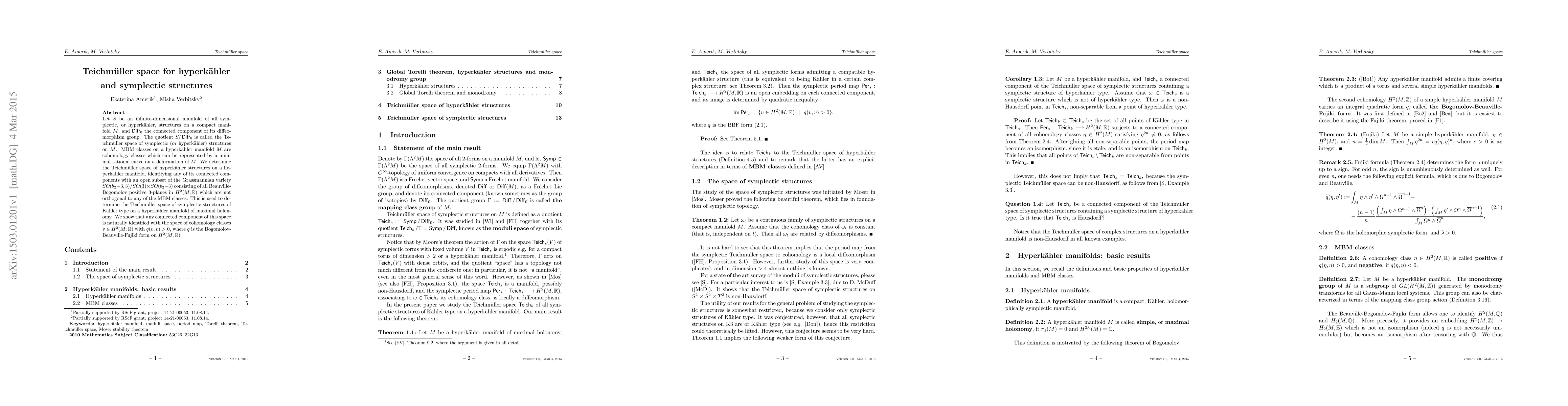 This paper explores the Teichmüller space of symplectic and hyperkähler structures on a compact manifold M, identifying the connected components of these spaces with specific subsets of the Grassmannian and the space of positive cohomology classes under the Bogomolov-Beauville-Fujiki form.
