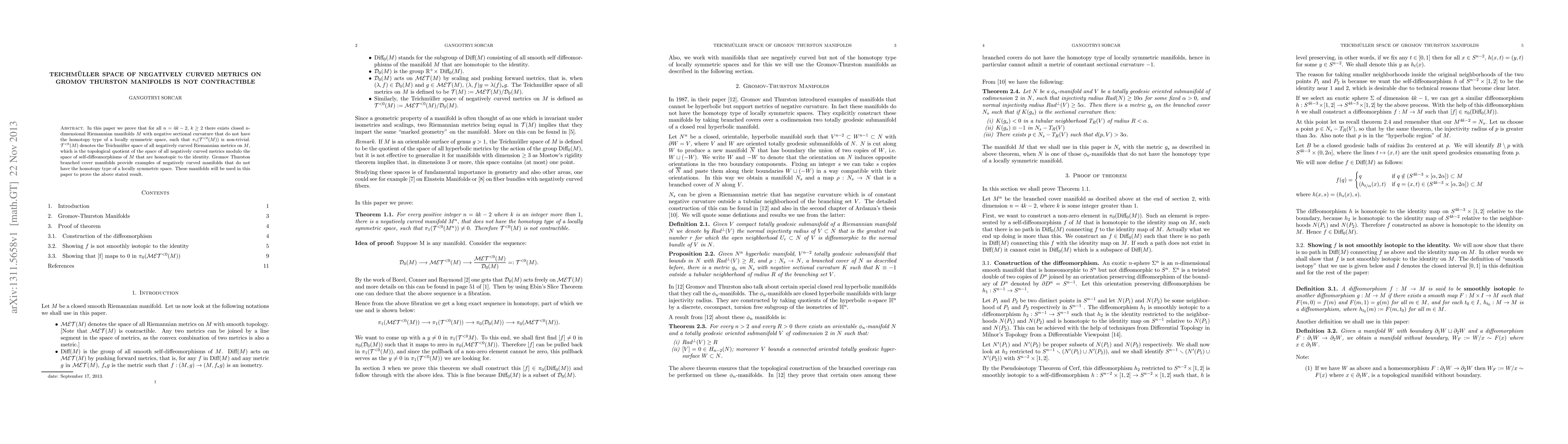 The paper demonstrates that for certain dimensions $n=4k-2$ ($k\ge2$), closed $n$-dimensional Riemannian manifolds with negative sectional curvature, specifically Gromov Thurston branched cover manifolds, do not have the homotopy type of a locally symmetric space, and their associated Teichmüller space of negatively curved metrics $\pi_{1}(\mathcal{T}^{<0}(M))$ is non-trivial, proving it is not contractible.
