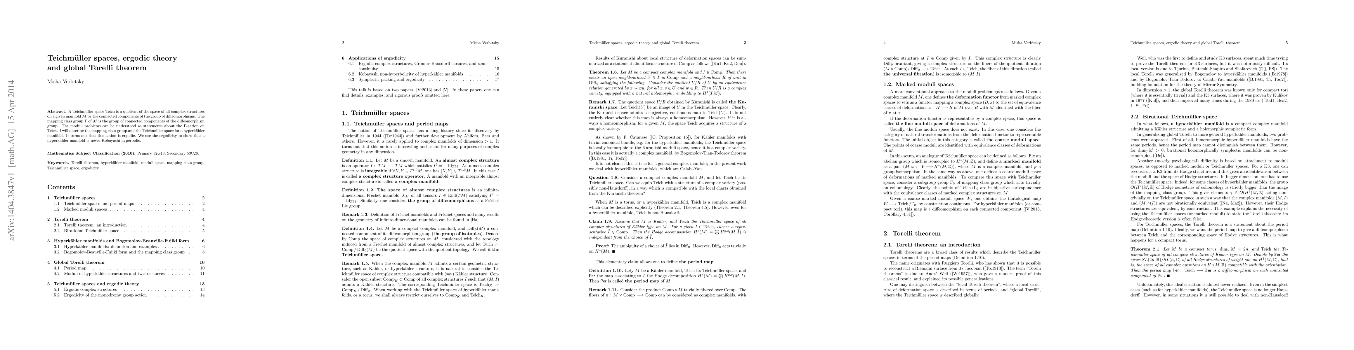 A Teichm\"uller space $Teich$ is a quotient of the space of all complex structures on a given manifold $M$ by the connected components of the group of diffeomorphisms. The mapping class group $\Gamma$ of $M$ is the group of connected components of the diffeomorphism group. The moduli problems can be understood as statements about the $\Gamma$-action on $Teich$. I will describe the mapping class group and the Teichmuller space for a hyperkahler manifold. It turns out that this action is ergodic. We use the ergodicity to show that a hyperkahler manifold is never Kobayashi hyperbolic. This is my ICM submission, with review of some of my work on Teichmuller spaces and moduli; proofs are sketched, new observations and some open problems added.
