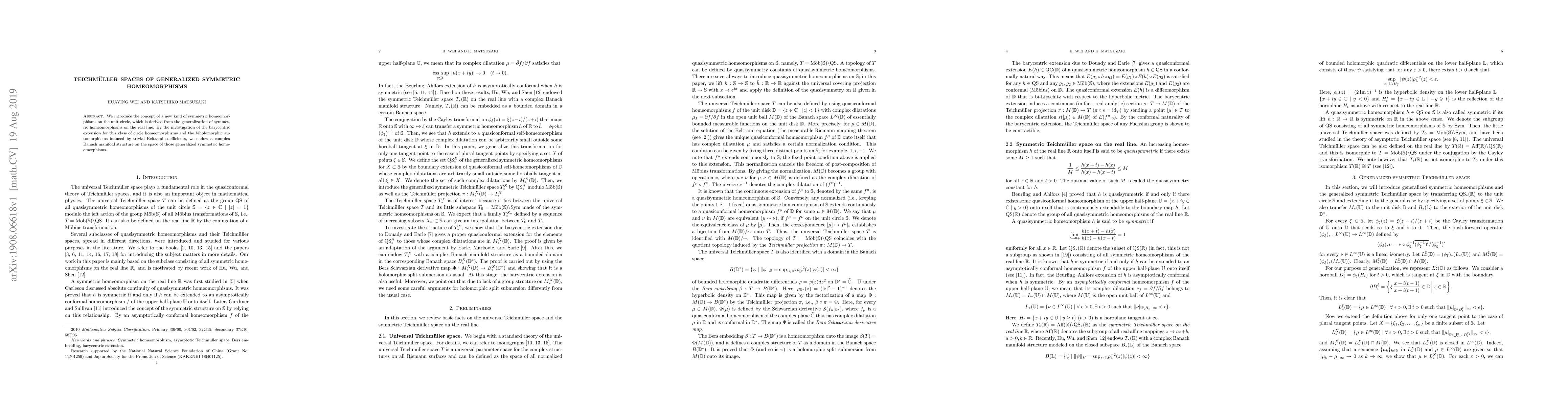 We introduce the concept of a new kind of symmetric homeomorphisms on the unit circle, which is derived from the generalization of symmetric homeomorphisms on the real line. By the investigation of the barycentric extension for this class of circle homeomorphisms and the biholomorphic automorphisms induced by trivial Beltrami coefficients, we endow a complex Banach manifold structure on the space of those generalized symmetric homeomorphisms.