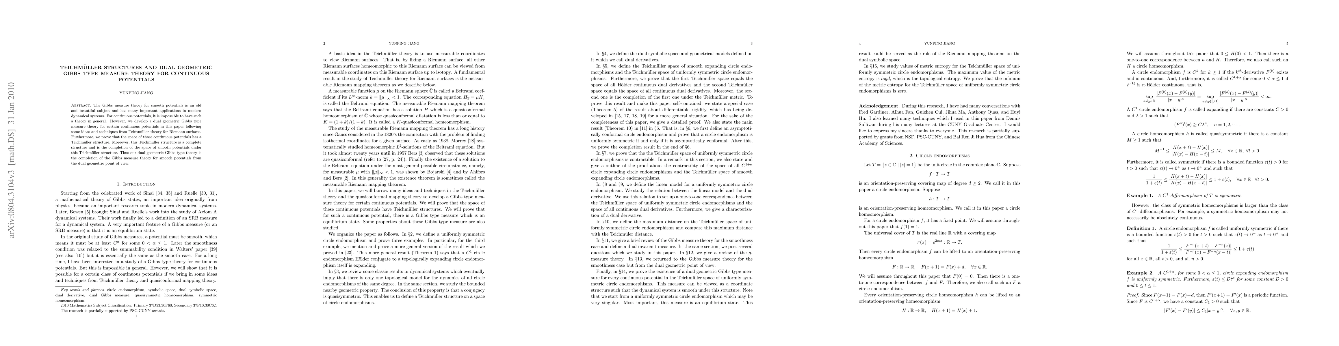 The Gibbs measure theory for smooth potentials is an old and beautiful subject and has many important applications in modern dynamical systems. For continuous potentials, it is impossible to have such a theory in general. However, we develop a dual geometric Gibbs type measure theory for certain continuous potentials in this paper following some ideas and techniques from Teichm\"uller theory for Riemann surfaces. Furthermore, we prove that the space of those continuous potentials has a Teichm\"uller structure. Moreover, this Teichm\"uller structure is a complete structure and is the completion of the space of smooth potentials under this Teichm\"uller structure. Thus our dual geometric Gibbs type theory is the completion of the Gibbs measure theory for smooth potentials from the dual geometric point of view.