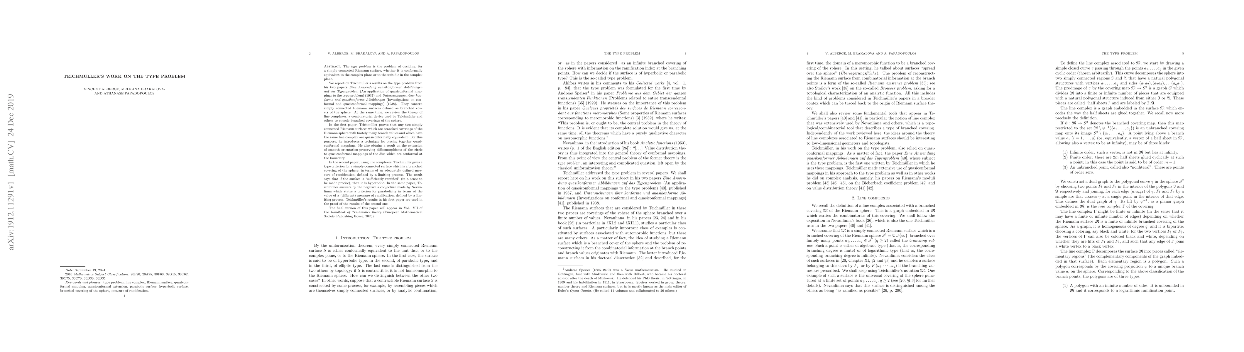 The type problem is the problem of deciding, for a simply connected Riemann surface, whether it is conformally equivalent to the complex plane or to the unit dic in the complex plane. We report on Teichm{\"u}ller's results on the type problem from his two papers Eine Anwendung quasikonformer Abbildungen auf das Typenproblem (An application of quasiconformal map-pings to the type problem) (1937) and Untersuchungen{\"u}ber kon-forme und quasikonforme Abbildungen (Investigations on con-formal and quasiconformal mappings) (1938). They concern simply connected Riemann surfaces defined as branched covers of the sphere. At the same time, we review the theory of line complexes, a combinatorial device used by Teichm{\"u}ller and others to encode branched coverings of the sphere. In the first paper, Teichm{\"u}ller proves that any two simply connected Riemann surfaces which are branched coverings of the Riemann sphere with finitely many branch values and which have the same line complex are quasiconformally equivalent. For this purpose, he introduces a technique for piecing together quasi-conformal mappings. He also obtains a result on the extension of smooth orientation-preserving diffeomorphisms of the circle to quasiconformal mappings of the disc which are conformal at the boundary. In the second paper, using line complexes, Teichm{\"u}ller gives a type criterion for a simply-connected surface which is a branched covering of the sphere, in terms of an adequately defined measure of ramification, defined by a limiting process. The result says that if the surface is ''sufficiently ramified'' (in a sense to be made precise), then it is hyperbolic. In the same paper, Te-ichm{\"u}ller answers by the negative a conjecture made by Nevan-linna which states a criterion for parabolicity in terms of the value of a (different) measure of ramification, defined by a limiting process. Teichm{\"u}ller's results in his first paper are used in the proof of the results of the second one.The final version of this paper will appear in Vol. VII of the Handbook of Teichm{\"u}ller theory (European Mathematical Society Publishing House, 2020).